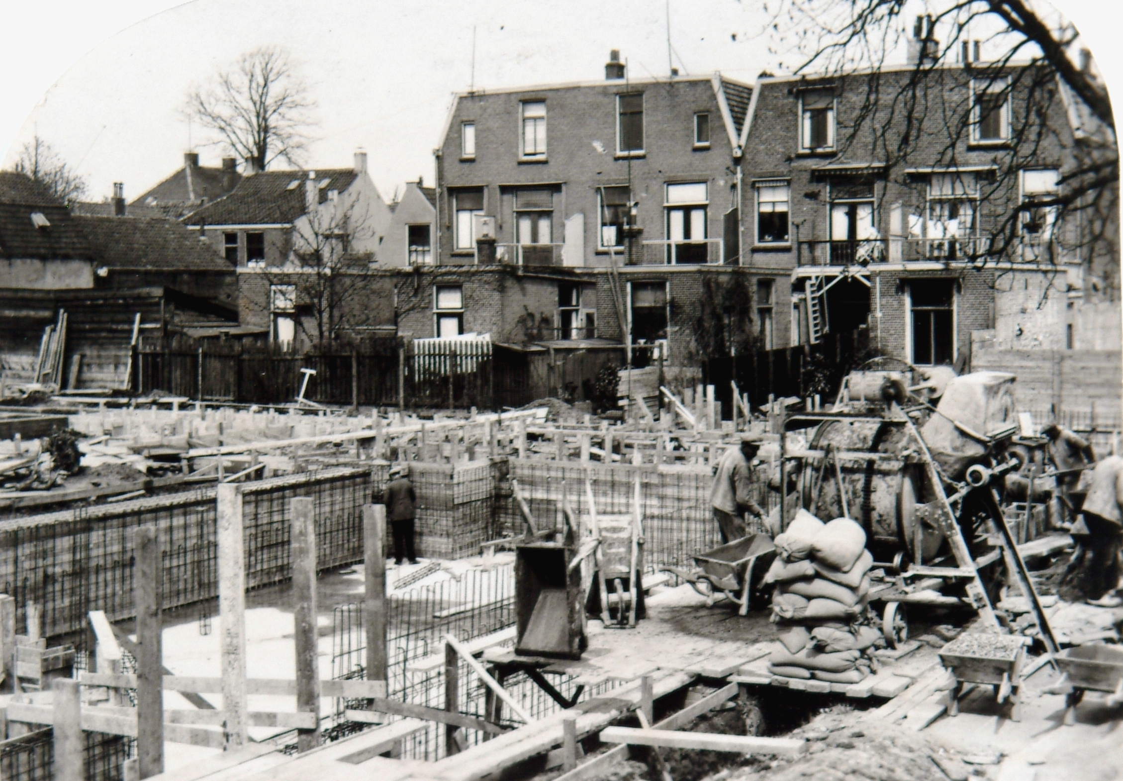 Gezicht op bouwwerkzaamheden aan de christelijke kweekschool aan de Van Godewijckstraat en de achtergevels van de huizen aan de Cornelis de Wittstraat (De school is inmiddels weer afgebroken)