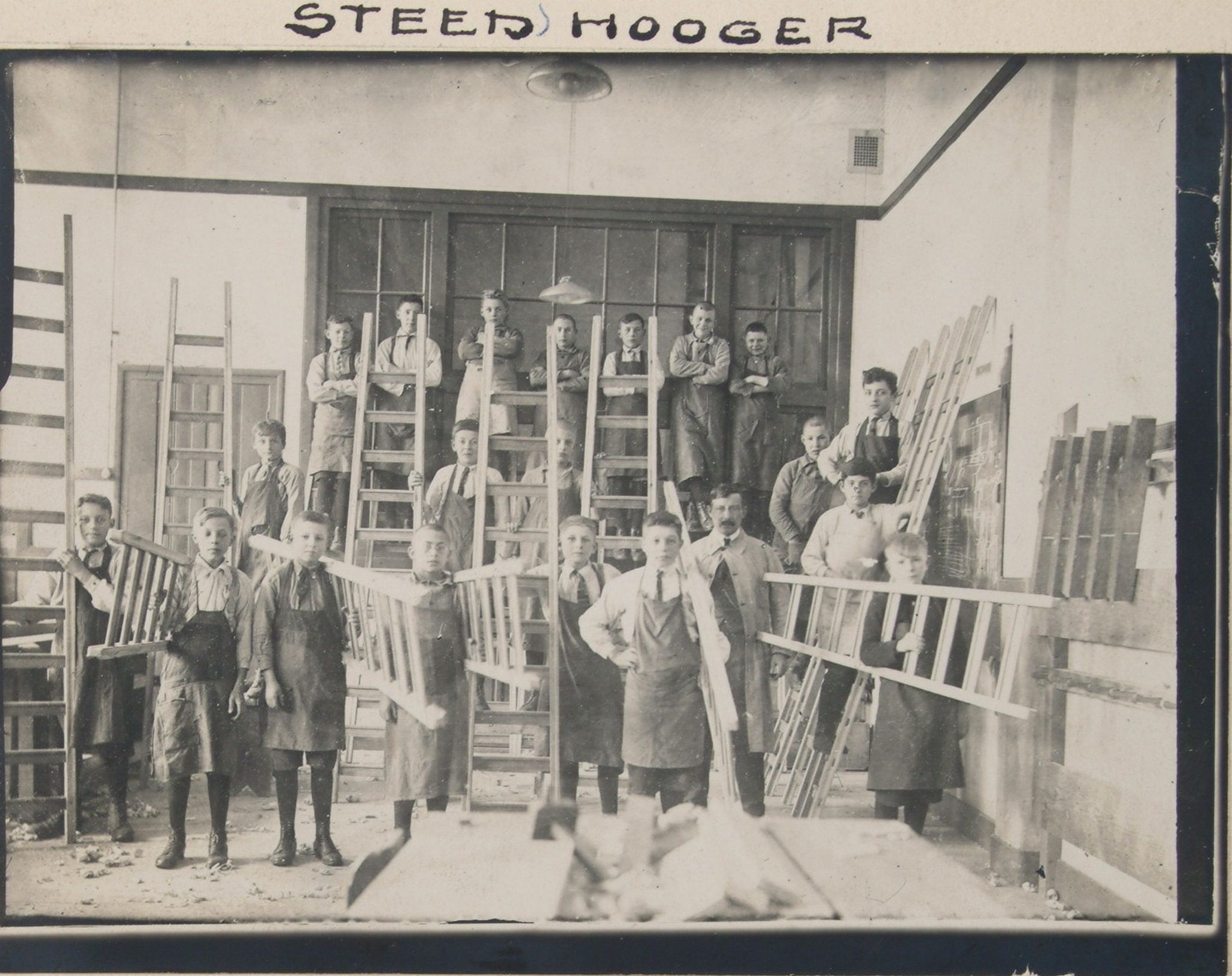 - Timmerklas met (zelfgemaakte) ladders van de Ambachtsschool met leraar timmeren, vaktekenen, constructietekenen en materialenkennis C.G. Kammerer. Onder het motto Steeds Hoger