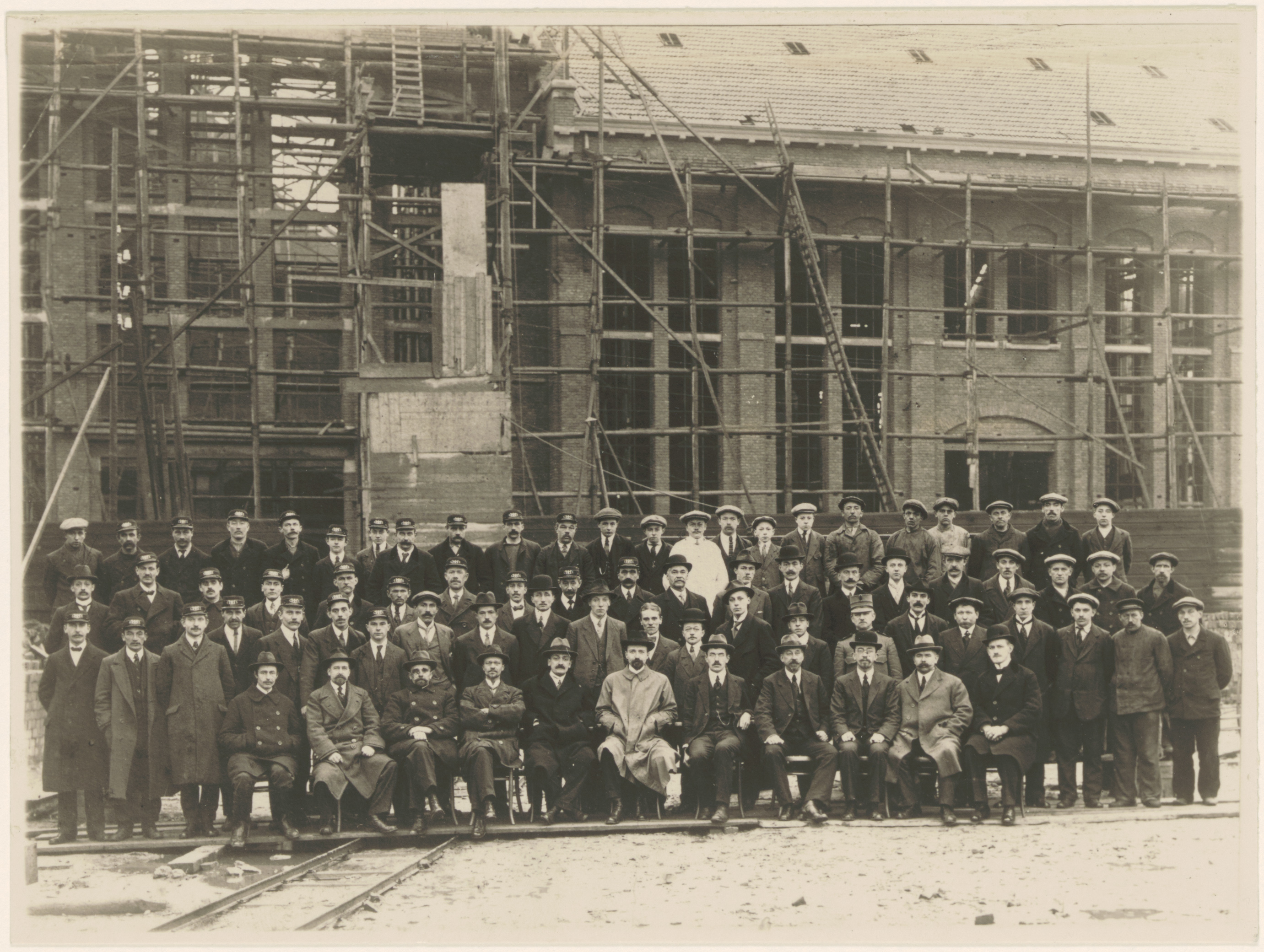Personeel van het G.E.B. bij het vertrek van directeur Ir. C. Noome, tijdens de bouw …