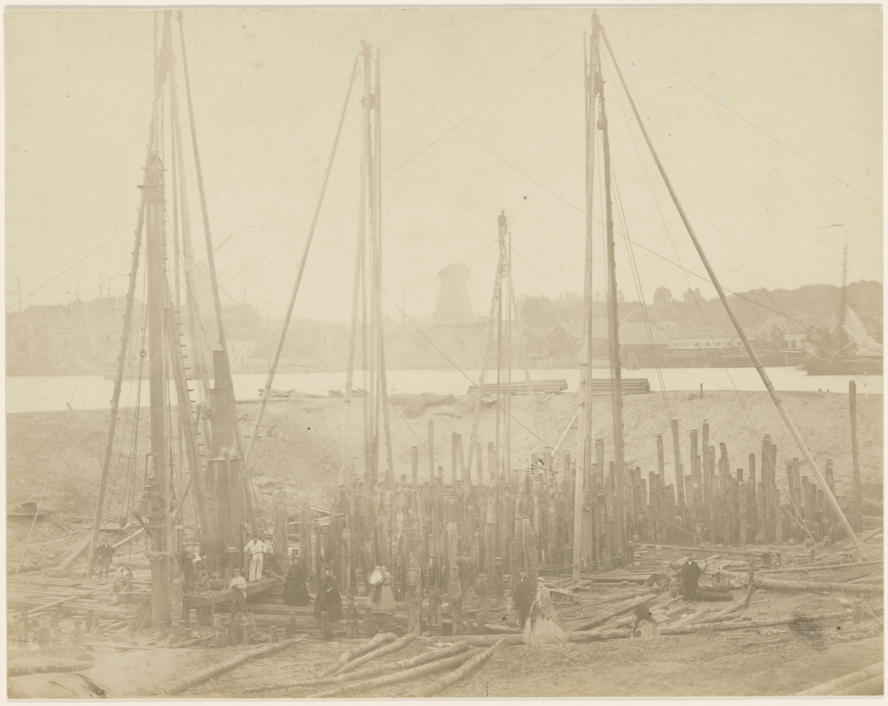 - Bouw van de fundering voor een van de pijlers van de spoorwegbrug over de Oude Maas. .