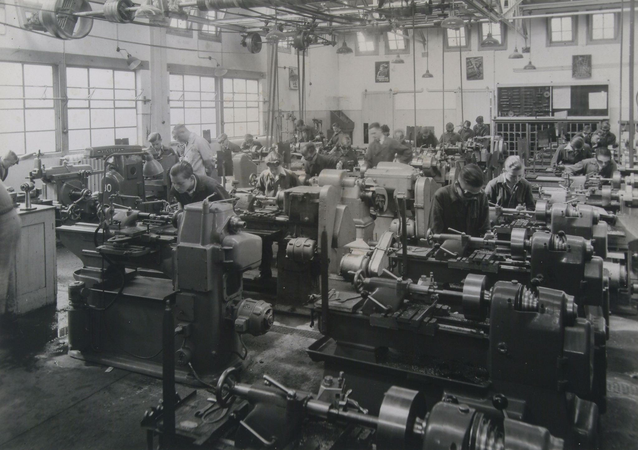- Lokaal van de afdeling metaalbewerking met draaibanken van de Ambachtsschool aan de Reeweg Oost