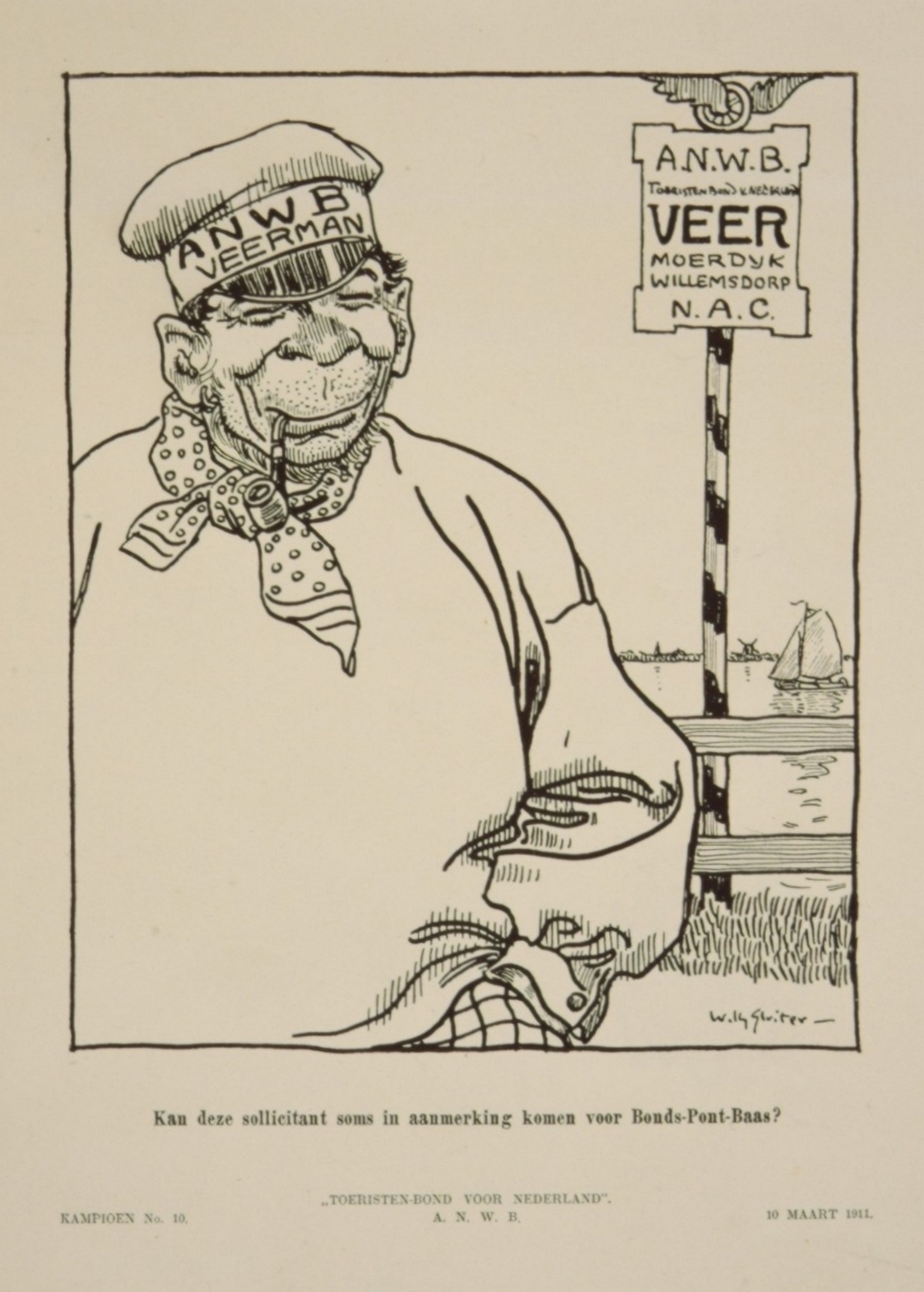 - Zinneprent op de wederoprichting van het stoombootveer Willemsdorp-Moerdijk. Een Hollandse boer of schipper vraagt zich het belang van fietsers en automobilisten bij deze zaak af, waarover in het voorjaar van 1911 veel werd geschreven.