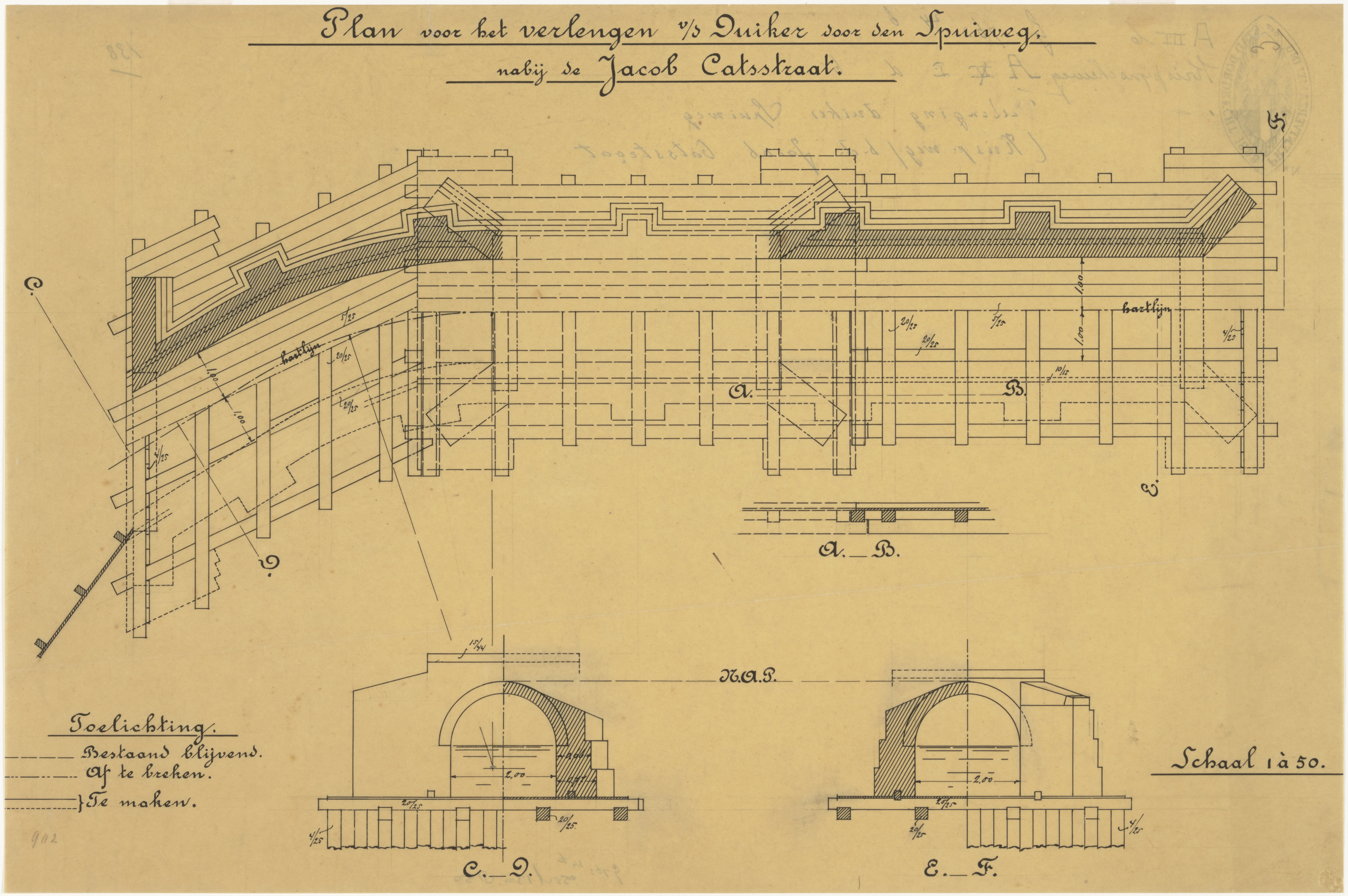- Bouwtekening voor de verlenging van de duiker door de Spuiweg (de latere Krispijnseweg) ter hoogte van de Jacob Catsstraat.