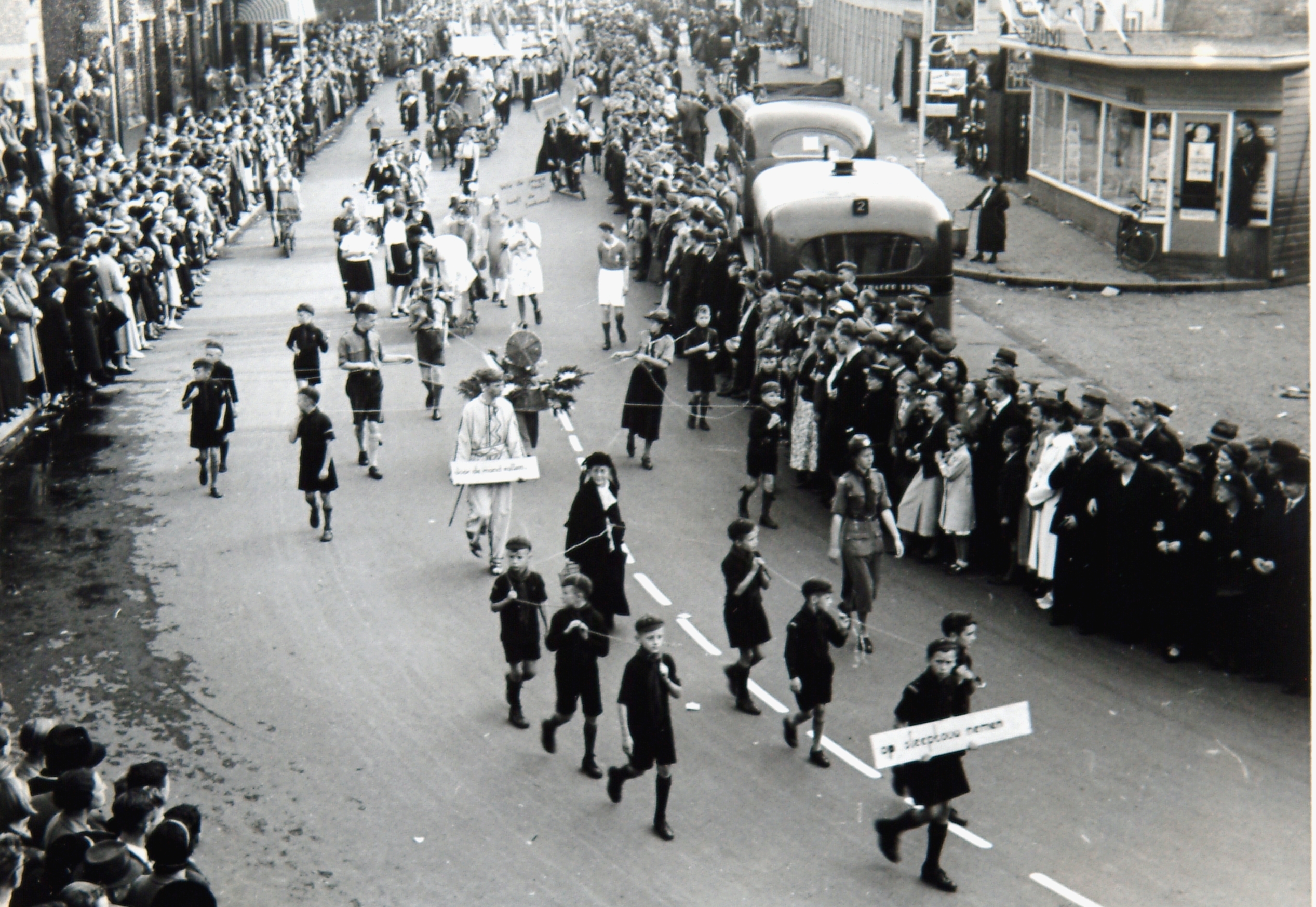 Spreekwoordenoptocht. Men loopt vanuit de Johan de Wittstraat langs het Achterom …