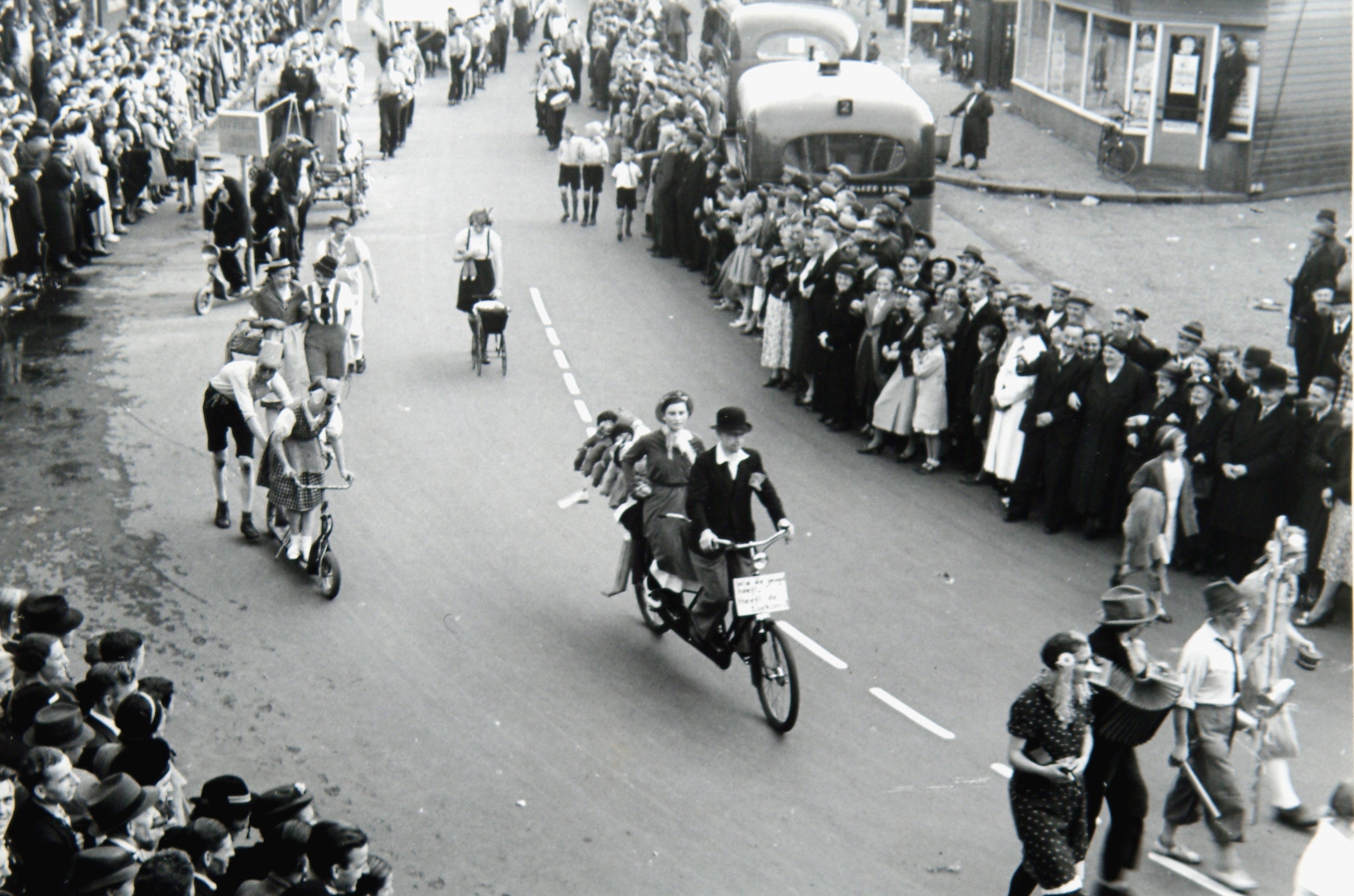 Spreekwoordenoptocht. Men loopt vanuit de Johan de Wittstraat langs het Achterom …