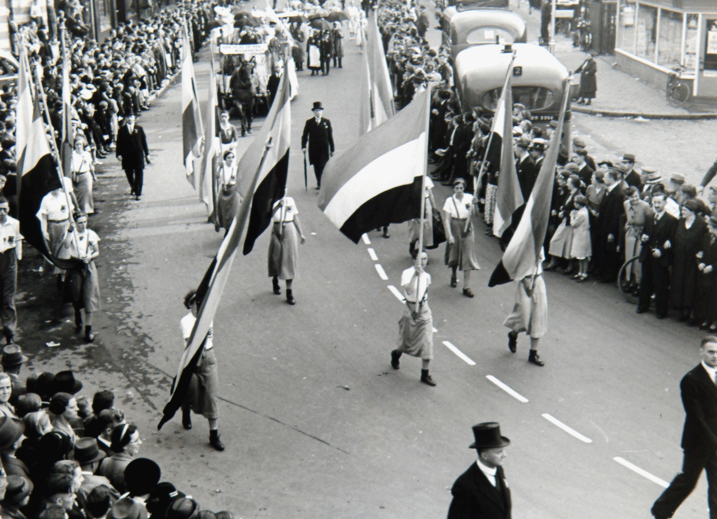 optochten publiek / toeschouwers stadsbussen vlaggen(stokken)