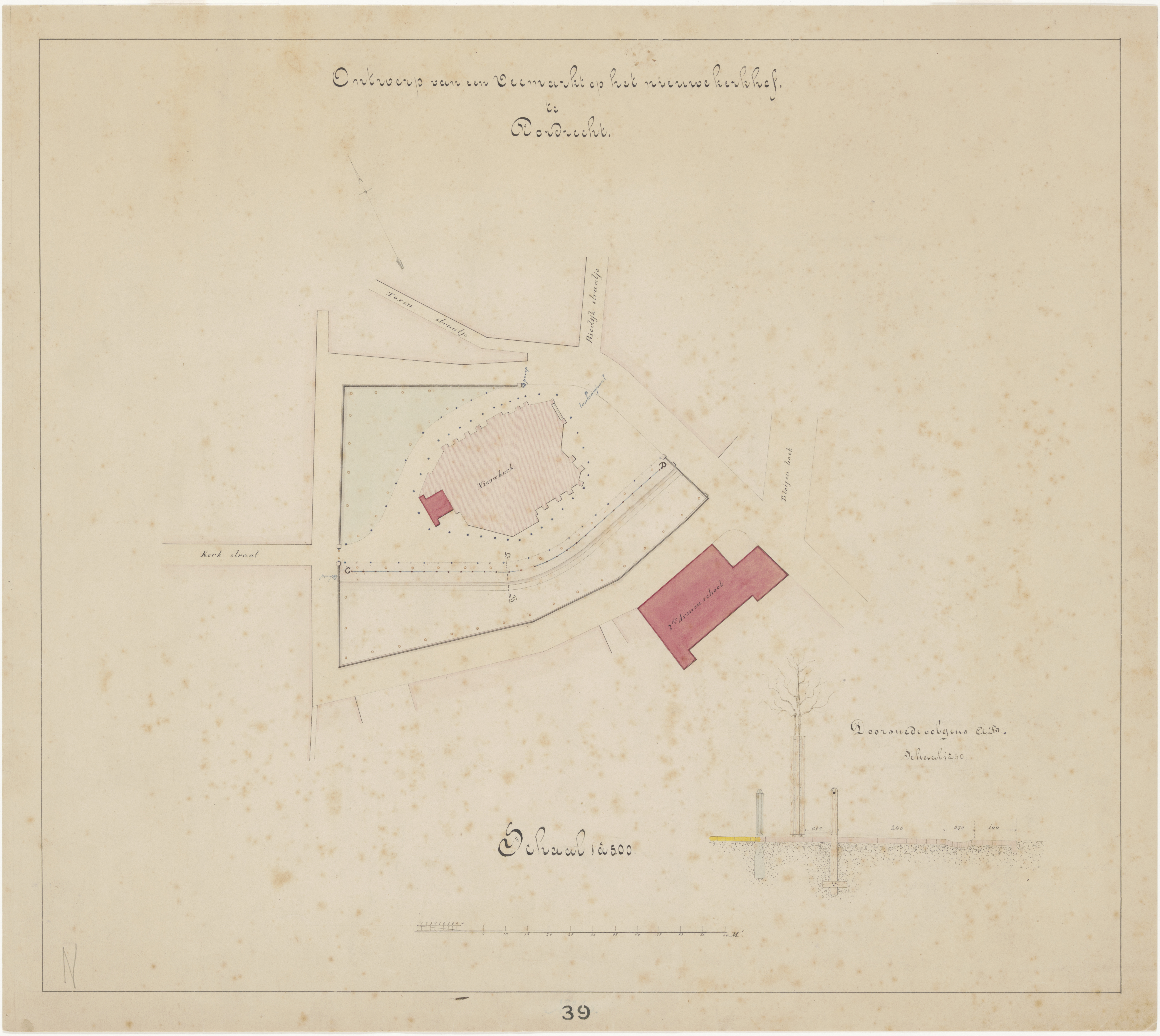 - Plattegrond van het Nieuwkerksplein, ingericht voor het gebruik als veemarkt. Rechtsonder wordt op een aparte tekening aangegeven hoe bomen, paaltjes en (mest)-goot ten opzichte van elkaar gesitueerd dienen te worden.