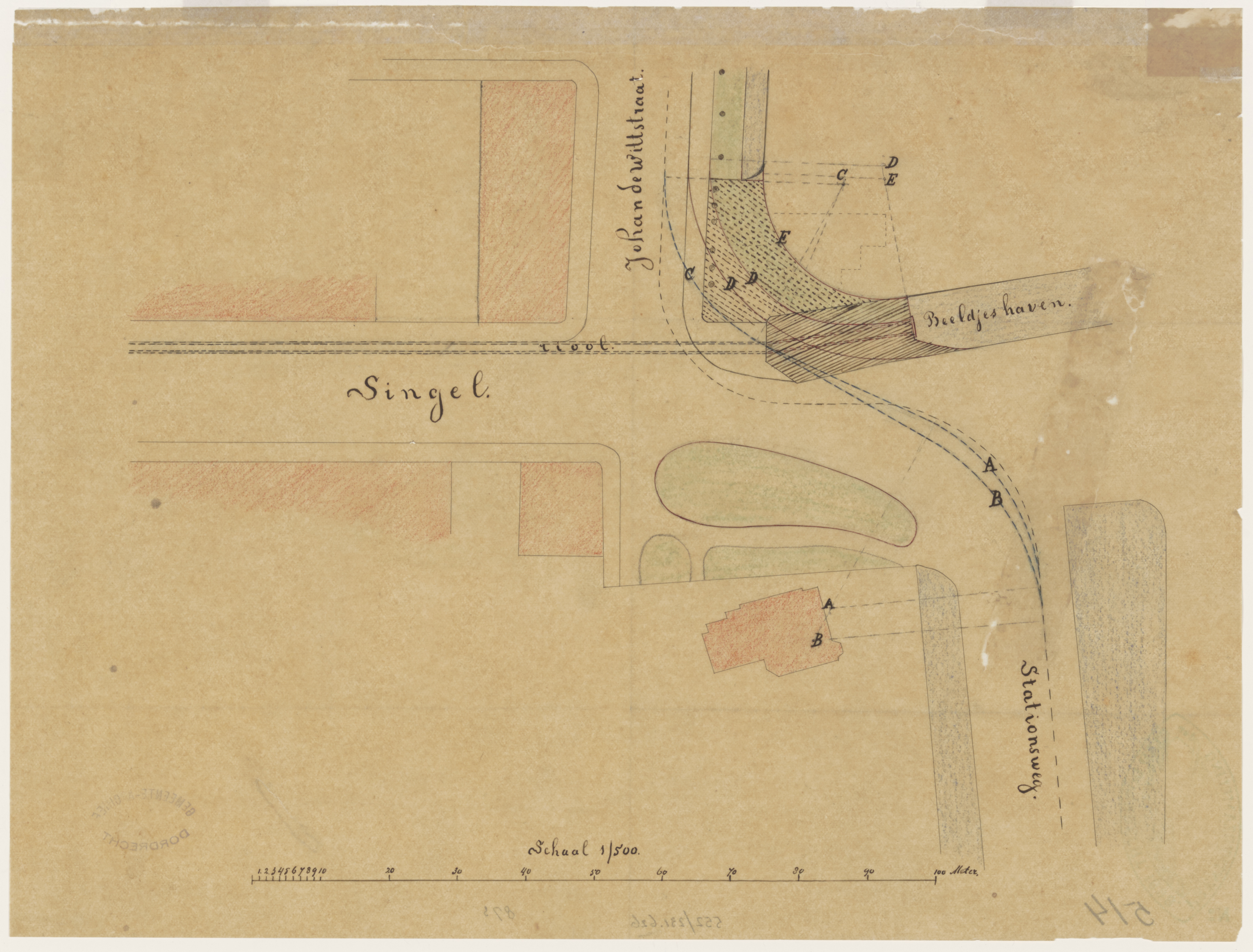 Plattegrond van de riolering (bestaande en geplande toestand) op het kruispunt Singel/Stationsweg/Johan de Wittstraat: door het dempen van een deel van de Beeldjeshaven wordt de bocht in de Stationsweg/Johan de Wittstraat minder scherp.