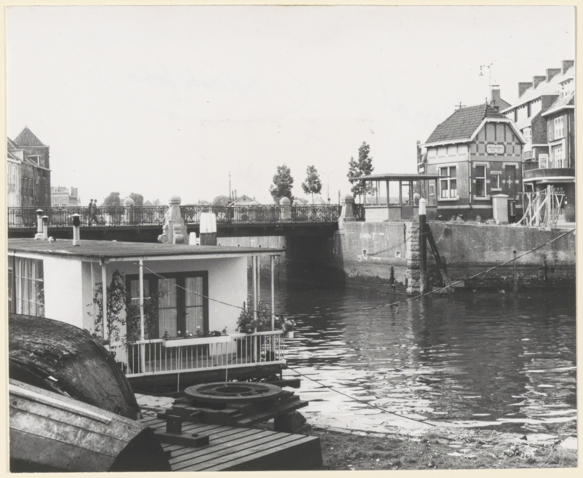 De Engelenburgerbrug, gezien vanaf de Houttuinen, met het oude in 1911 gebouwde brugwachtershuisje en het nieuwe in 1960 gebouwde huisje naast elkaar.