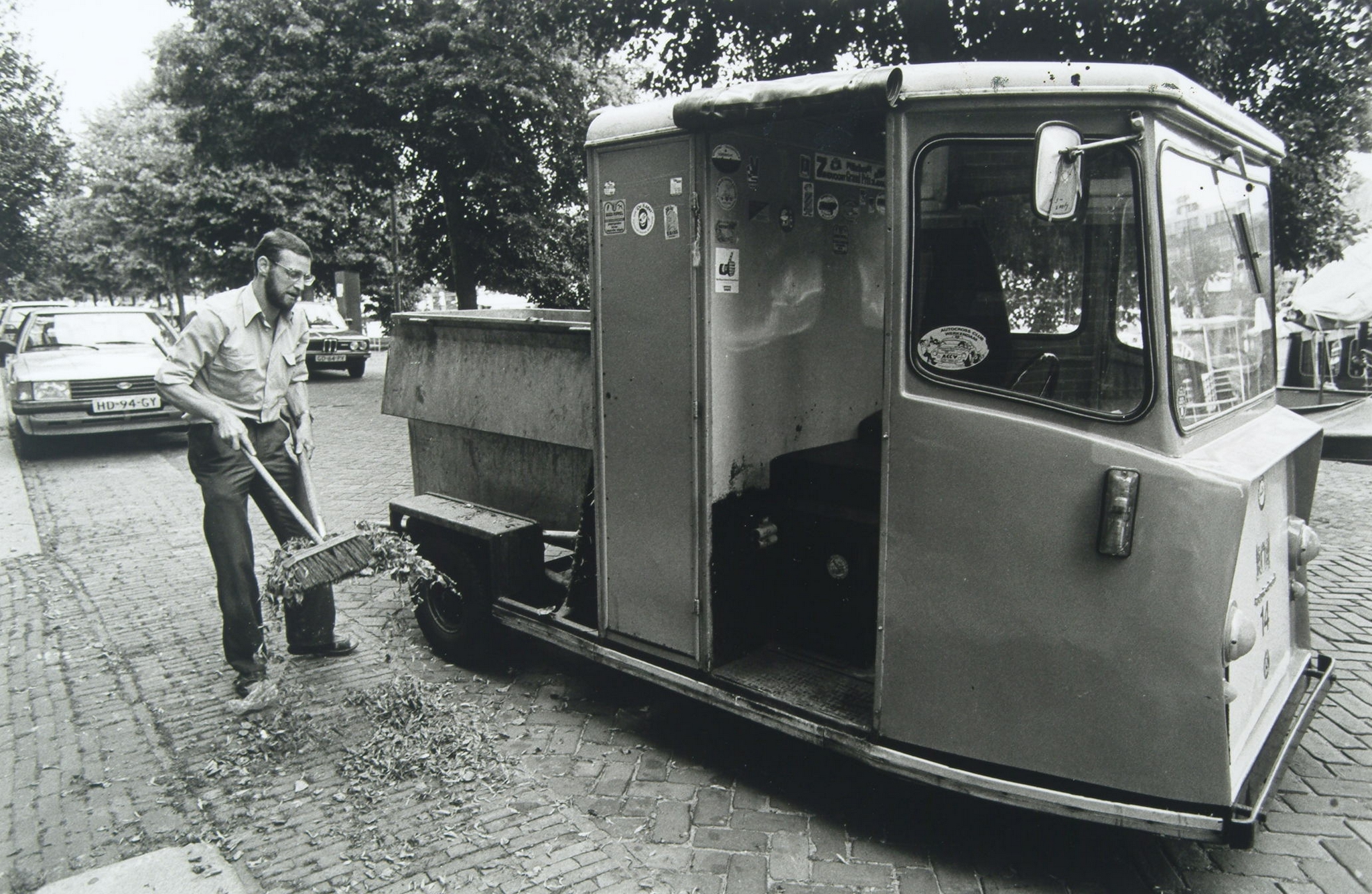Medewerker Reinigingsdienst is Dirk Franken(geb.1950)Het voertuig is een 3 wielige Spijkstaal electrokar. De locatie is waarschijnlijk Wolwevershaven.In 2011 is Dirk -nog steeds met baard- werkzaam als reiniger bij de veegdienst en probeert Dordrecht schoon te houden. De handbezem en schep zijn inmiddels ingewisseld voor een zuig/veegmachine.