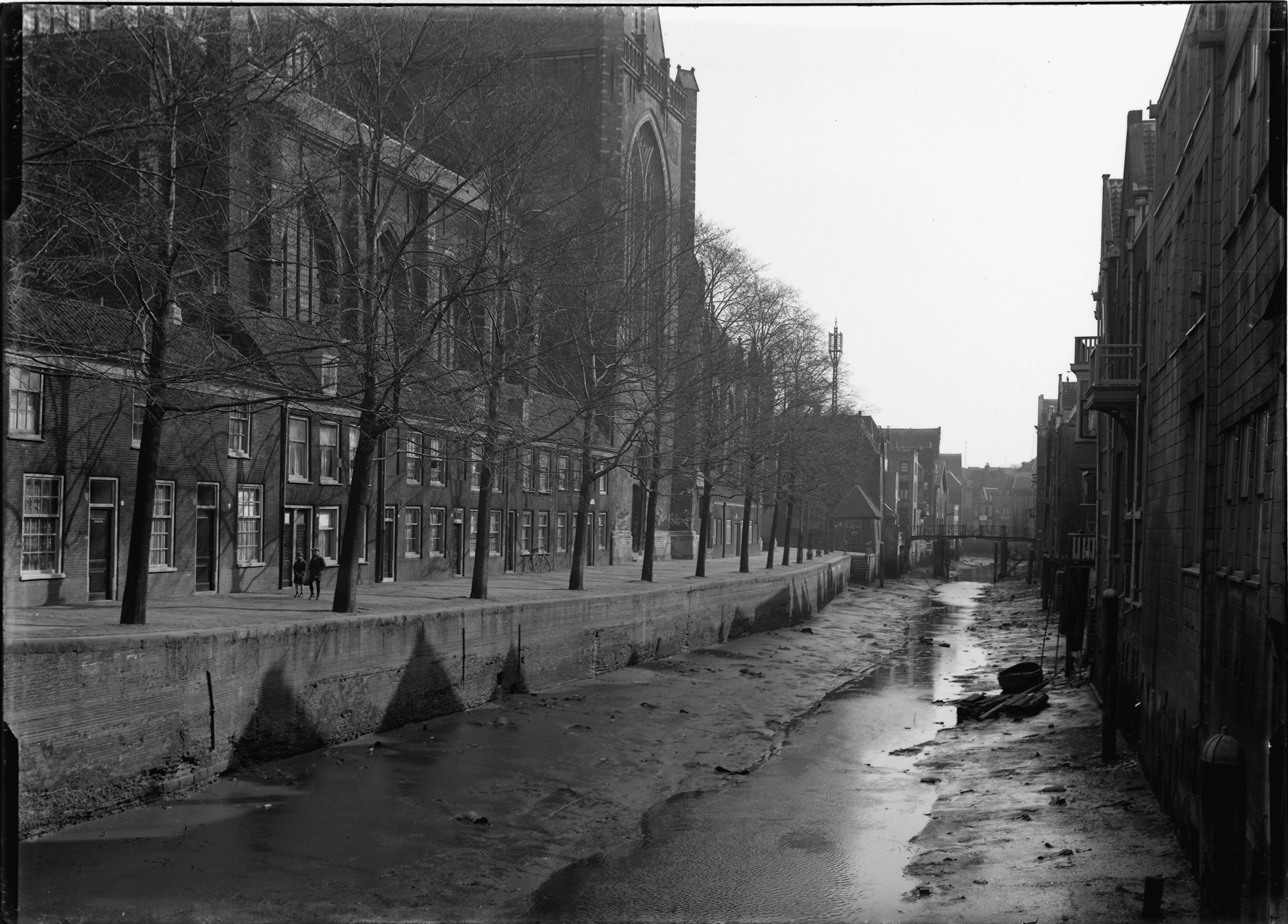 - Bijna drooggevallen Voorstraatshaven bij de Grote Kerk langs de Pottenkade, van Leuvebrug naar Pelserbrug gezien. Rechts de achterkant van huizen aan de Voorstraat.