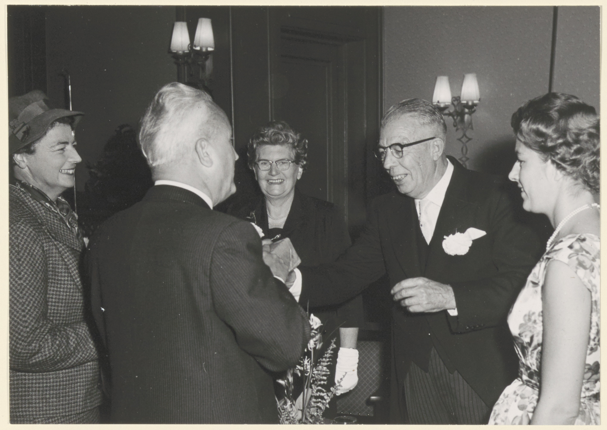 Afscheid van directeur D. Hoebee van de scheepswerf P. Hoebee. V.l.n.r. mevr. De …