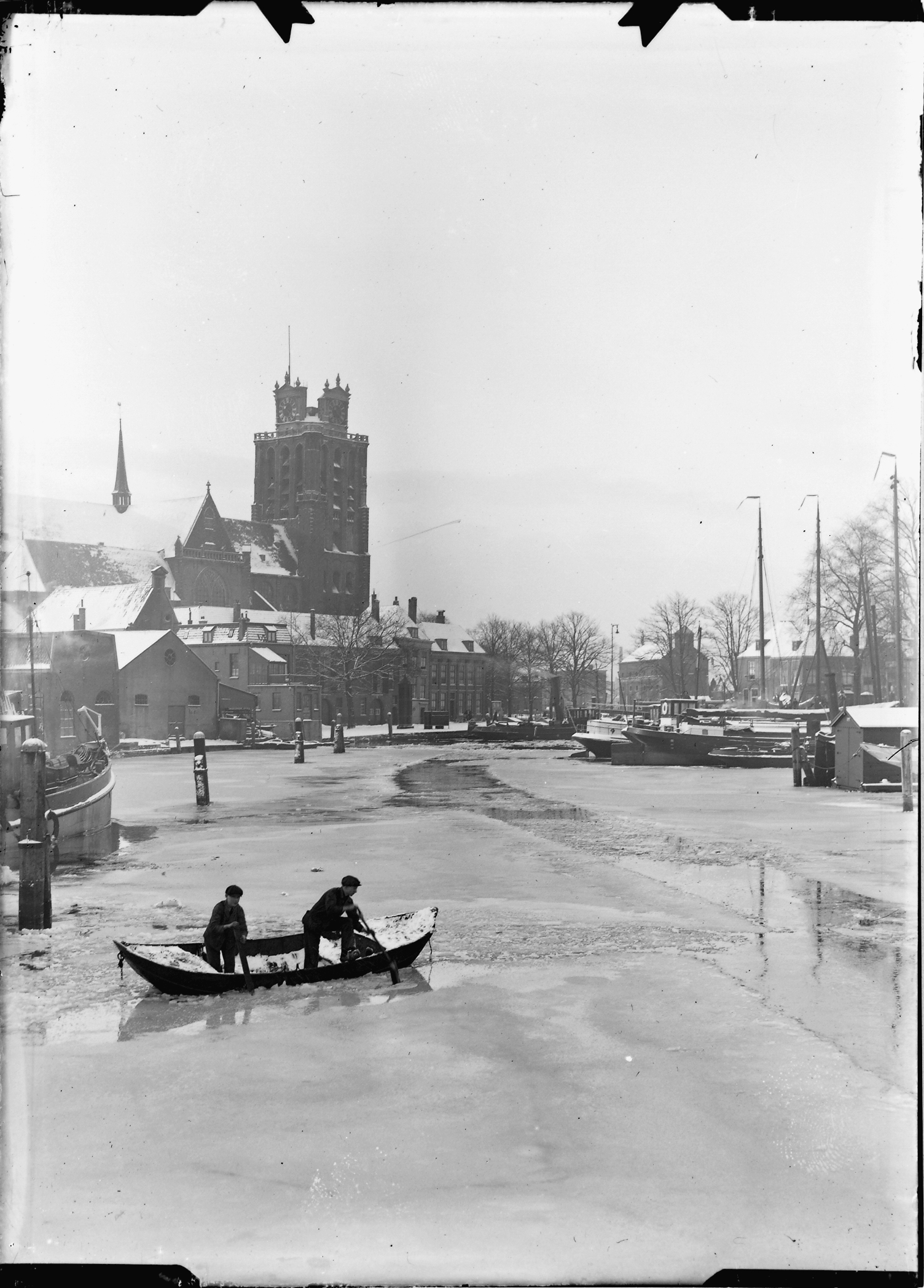 - ijsgang kerken militaire gebouwen pakhuizen roeiboten rondelen vrachtboten winter