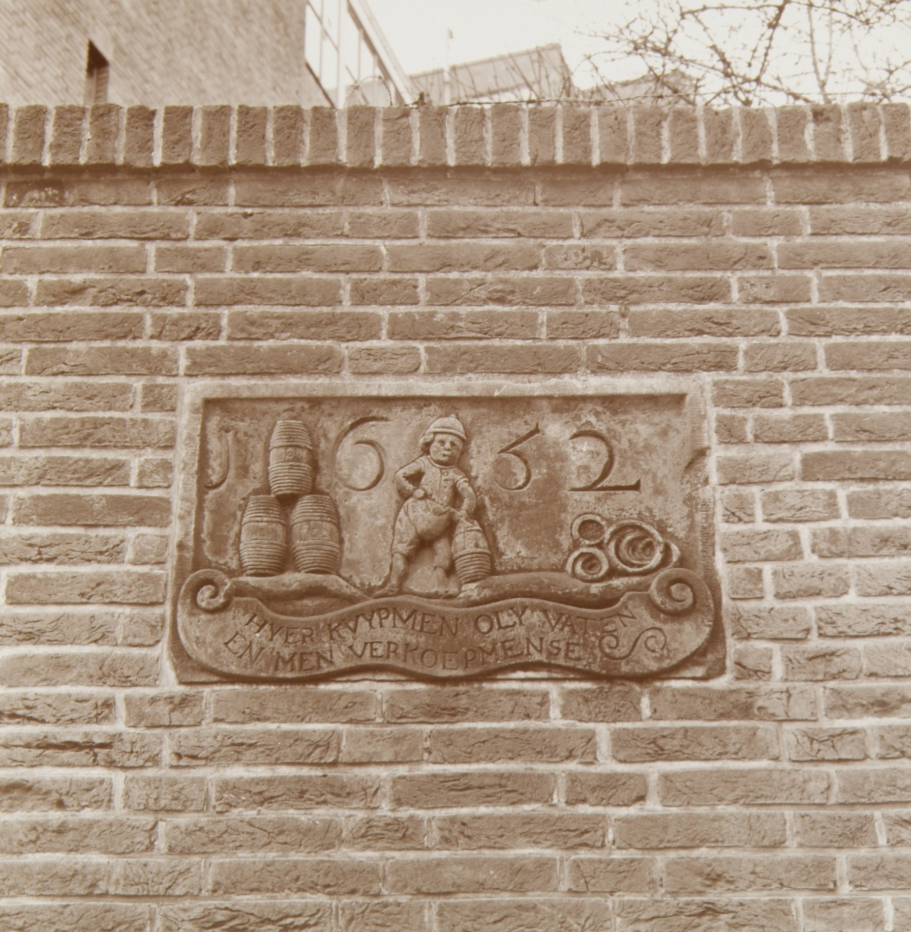 - Gevelsteen van een kuiperij met verminkt spreekwoord in een nieuwe muur in de omgeving van de Boogjes.