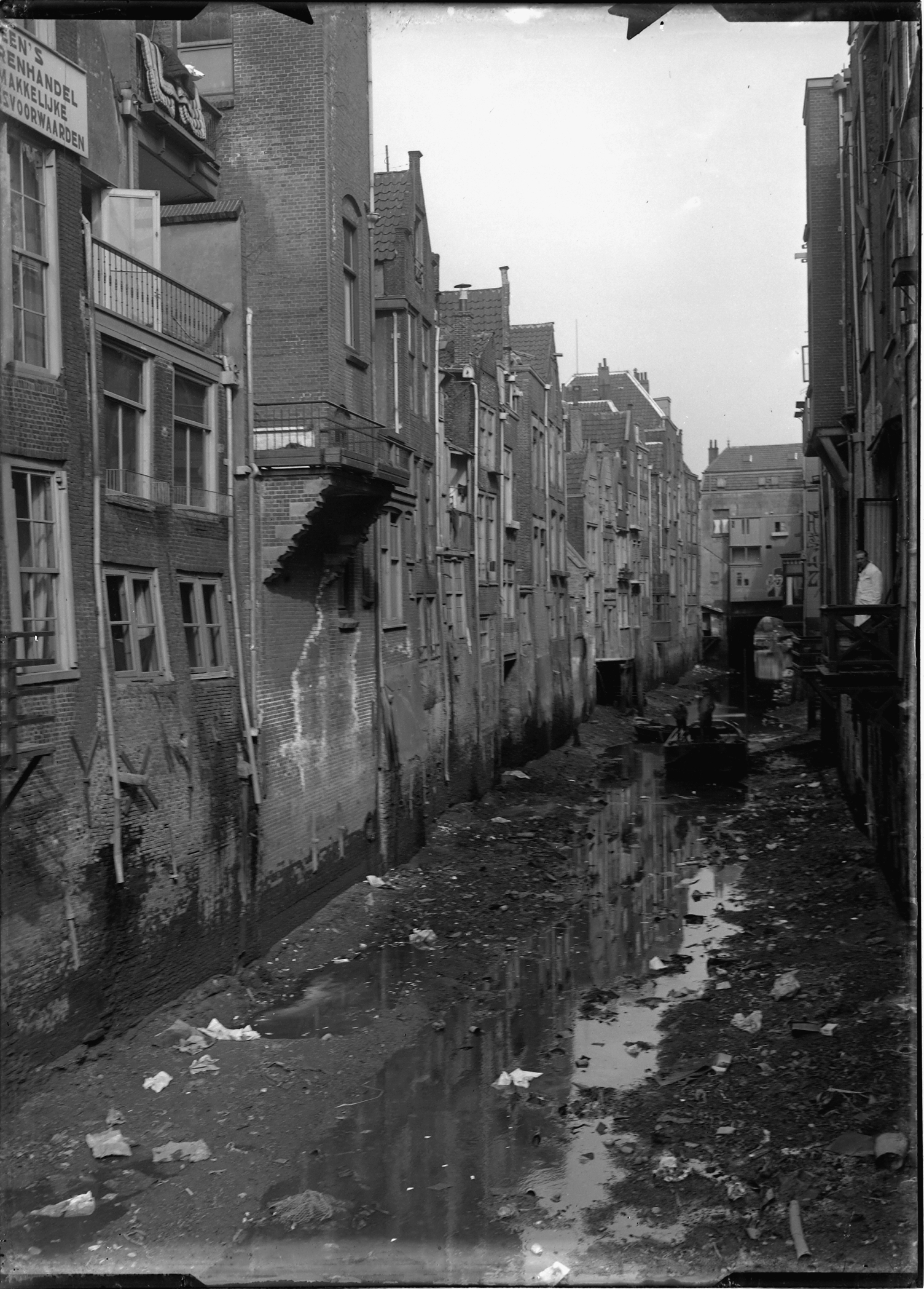 - Bijna drooggevallen Voorstraatshaven in oostelijke richting naar de Lombardbrug gezien. Links is de Grotekerksbuurt, rechts de Voorstraat.