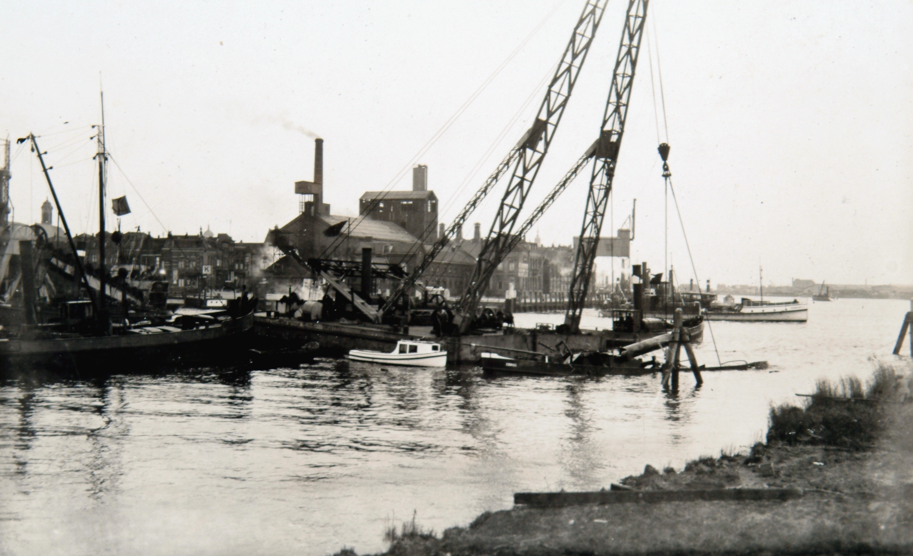 - Het lichten van sleepboot Namur die in de mond van het Wantij gezonken was. Op de achtergrond de veerboot en het Papendrechts Veer. Het hoge gebouw is de gasfabriek aan de Merwekade.