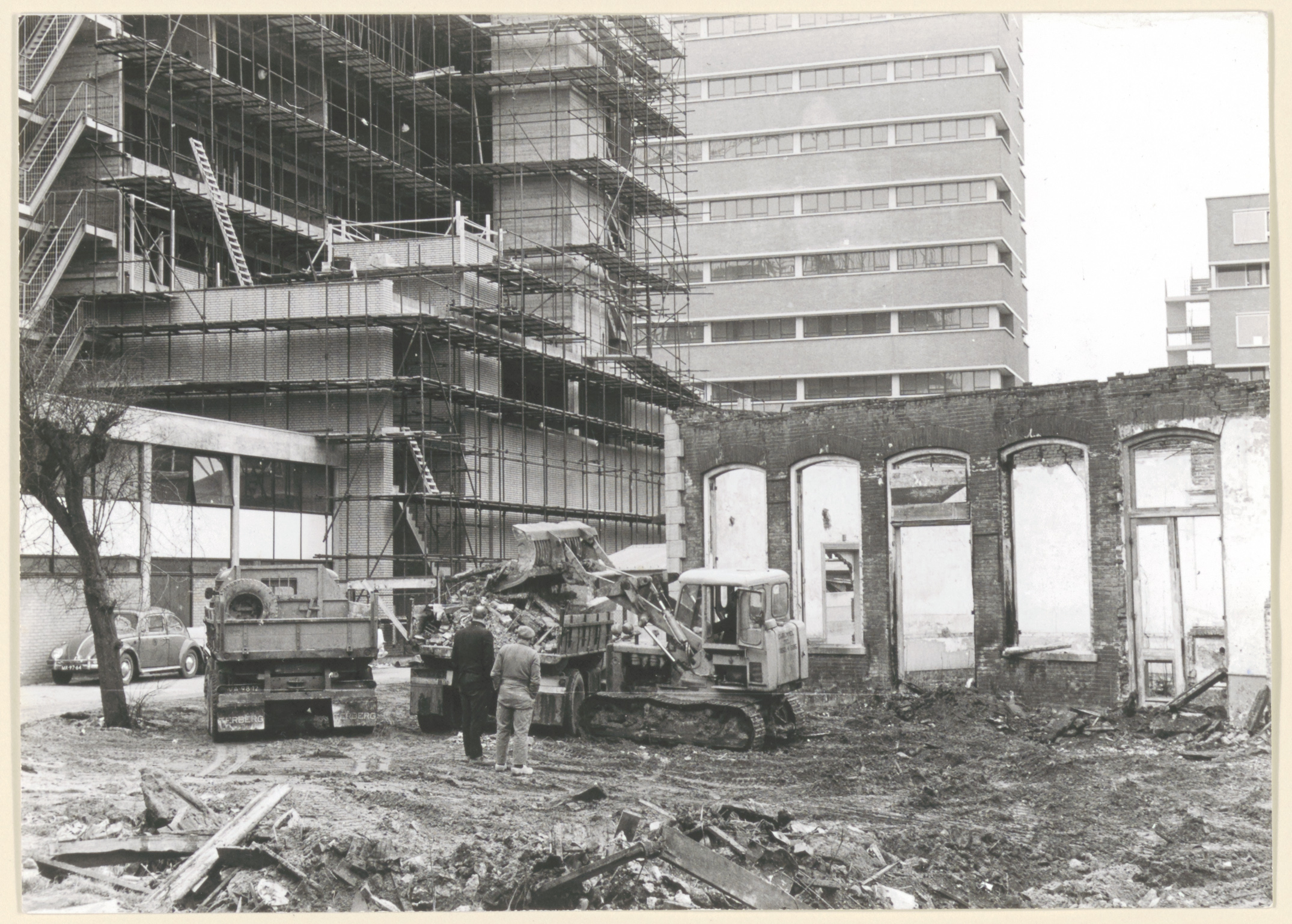 De sloop van huizen aan het Achterom/Raamstraat: links de bouw van het kantoor van de …