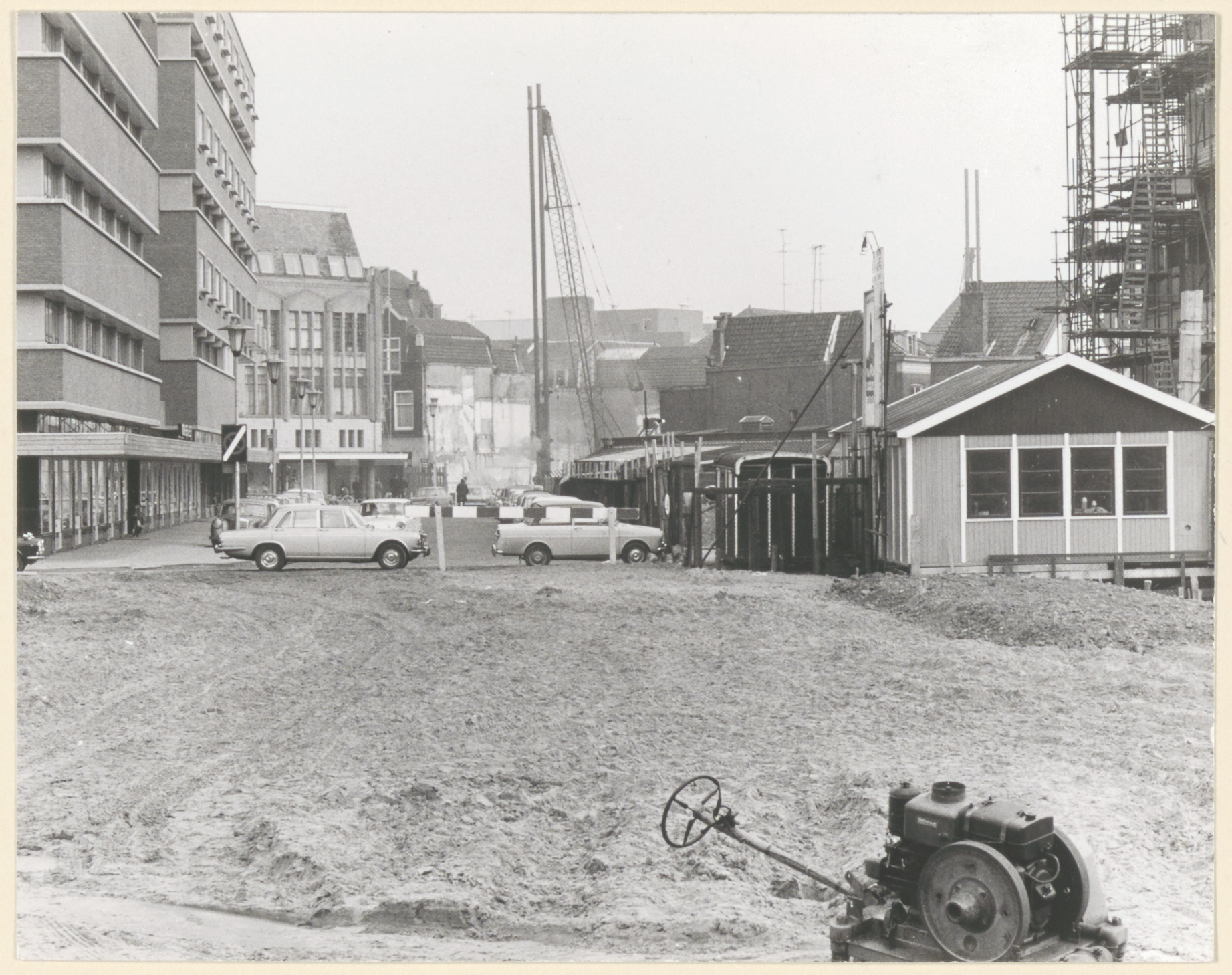 Nieuwbouw aan het Achterom, gezien vanaf de Spuiboulevard; op de achtergrond het warenhuis van Linders.