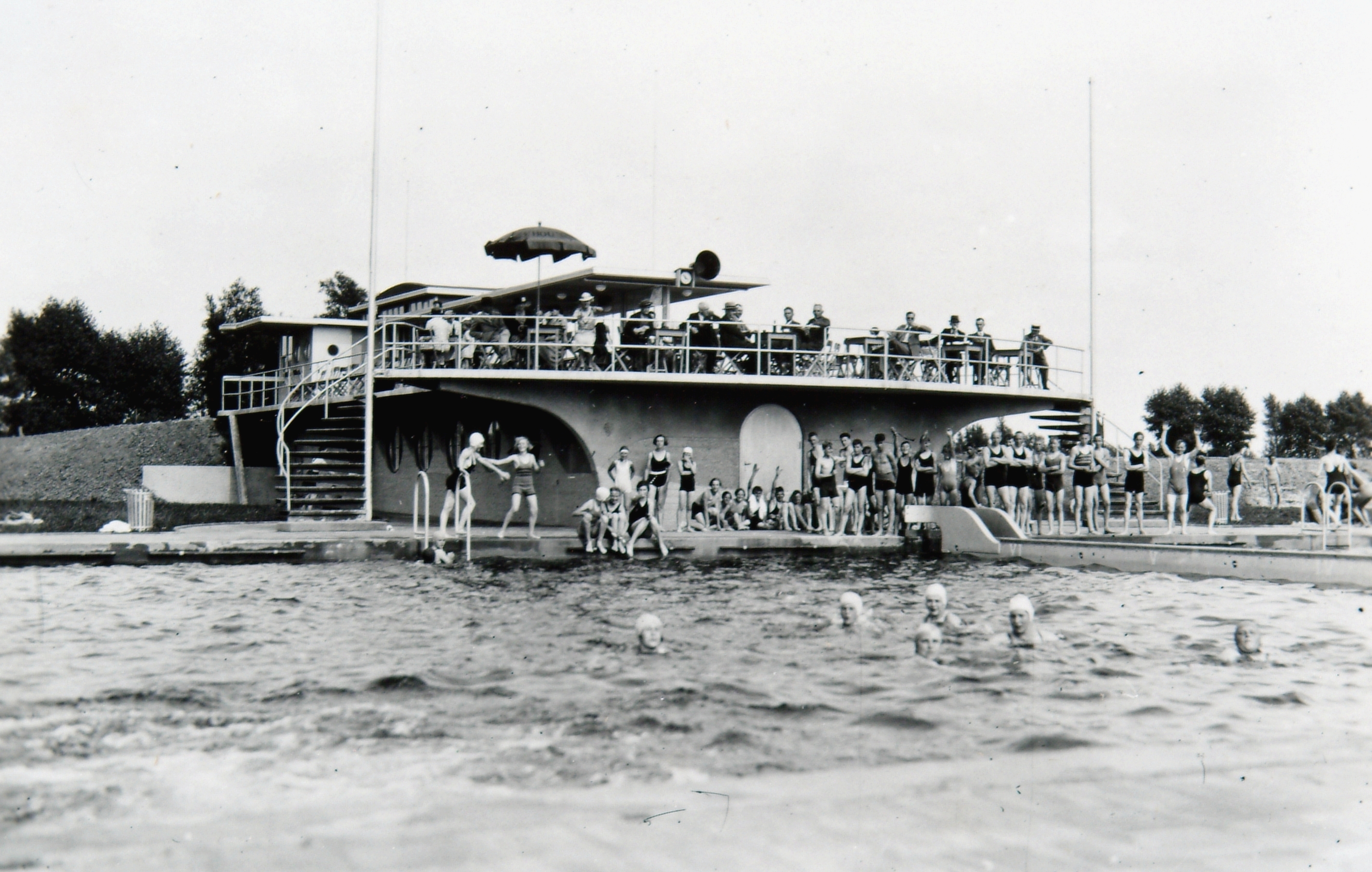 - Het "dames diepe" en het terras van het pas geopende Wantijbad. Achter de ponton was het diepe bassin voor de heren.