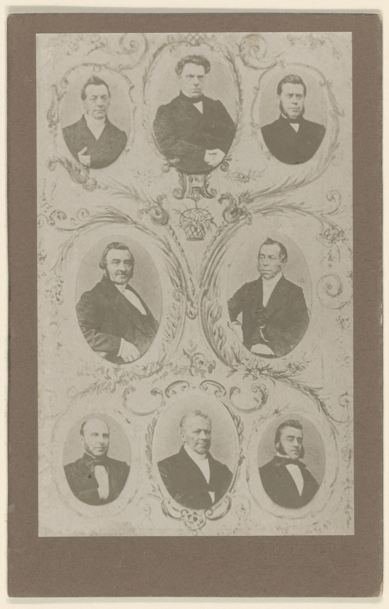 Predikanten Nederlands Hervormde Kerk te Dordrecht. 8 portretten in ovale lijstjes, op 1 vel. V.l.n.r. 1e rij: W.R. Veder, D. Pijzel, W.J.O. Sluiter; 2e rij: A.H. Blom, Th. A. Fruin; 3e rij: P.M. Keller van Hoorn, C. Simons, P. Steen.