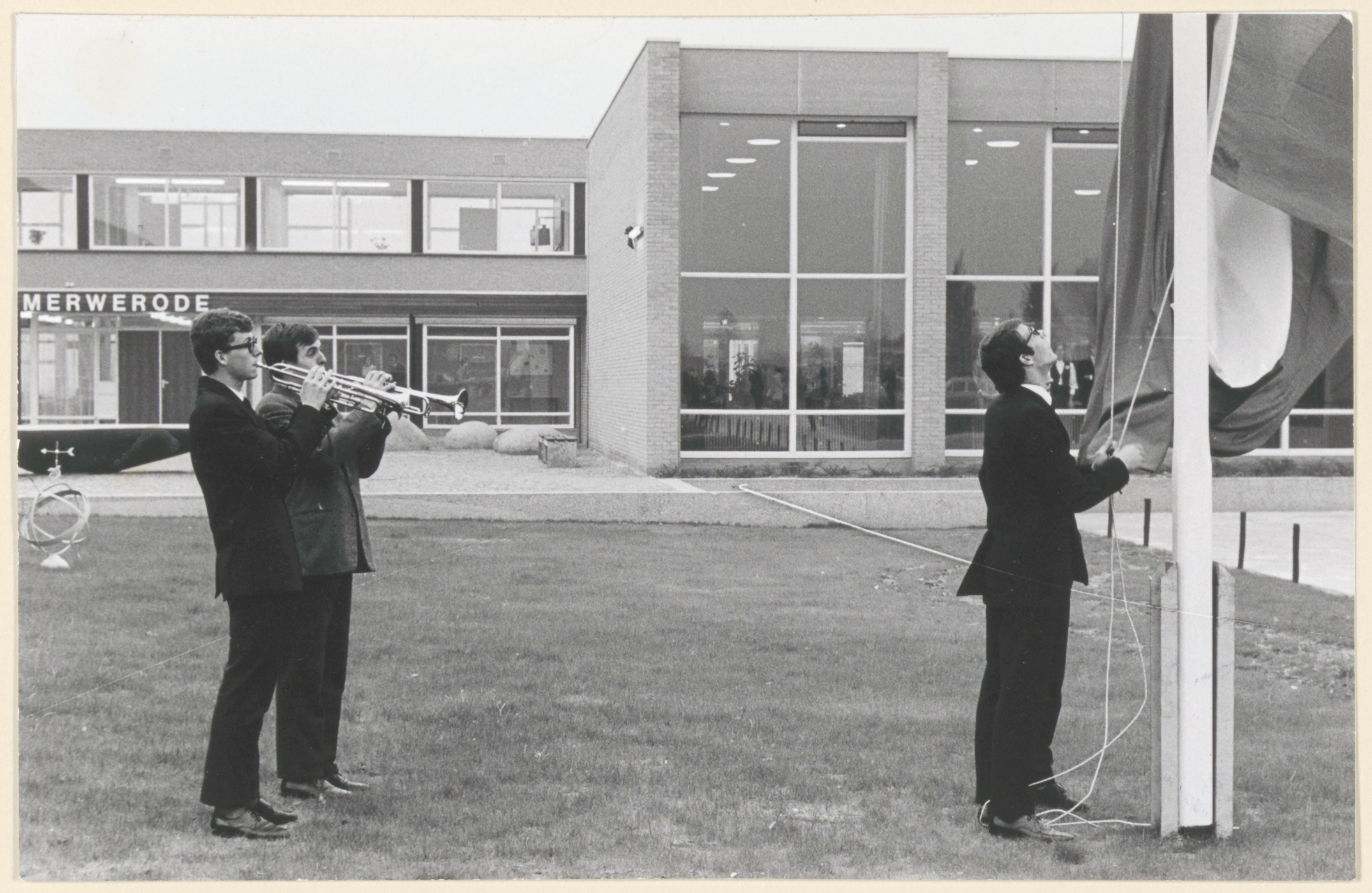 - De Protestants Christelijke Pedagogische academie Merwerode aan de Oudendijk. Onder trompetgeschal wordt de vlag gehesen.