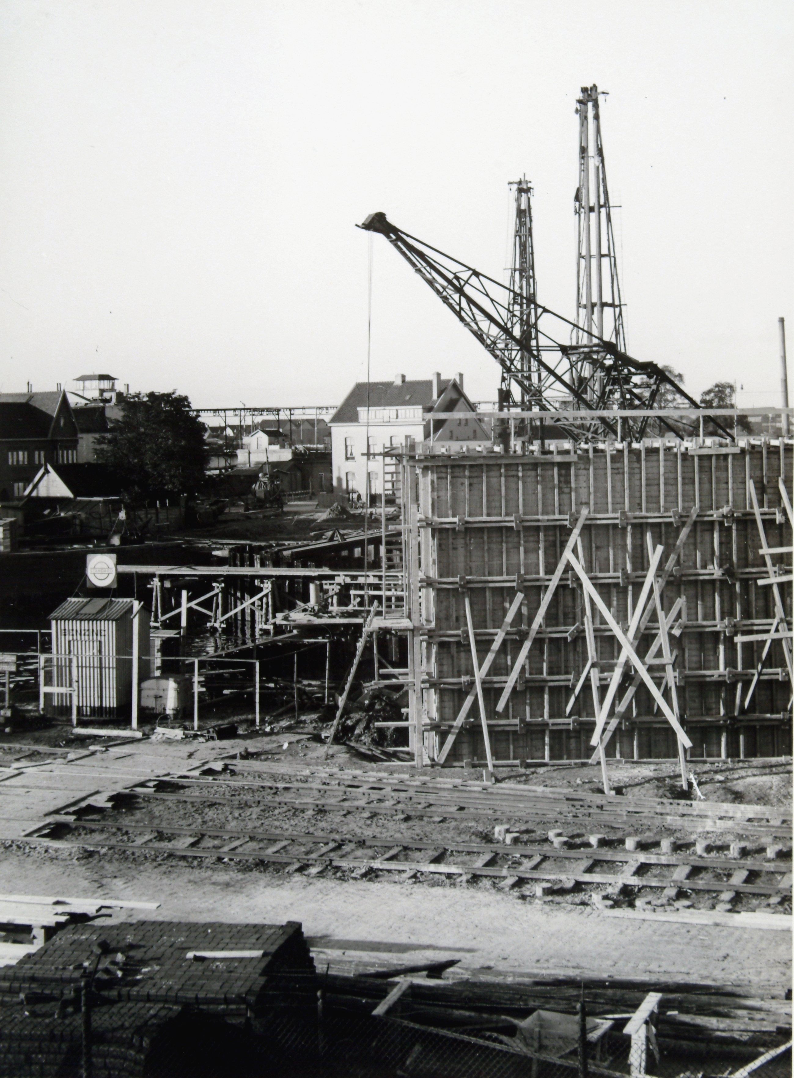 Bouw van pijlers over de Spoorweghaven voor het viaduct van de verkeersbrug over de …