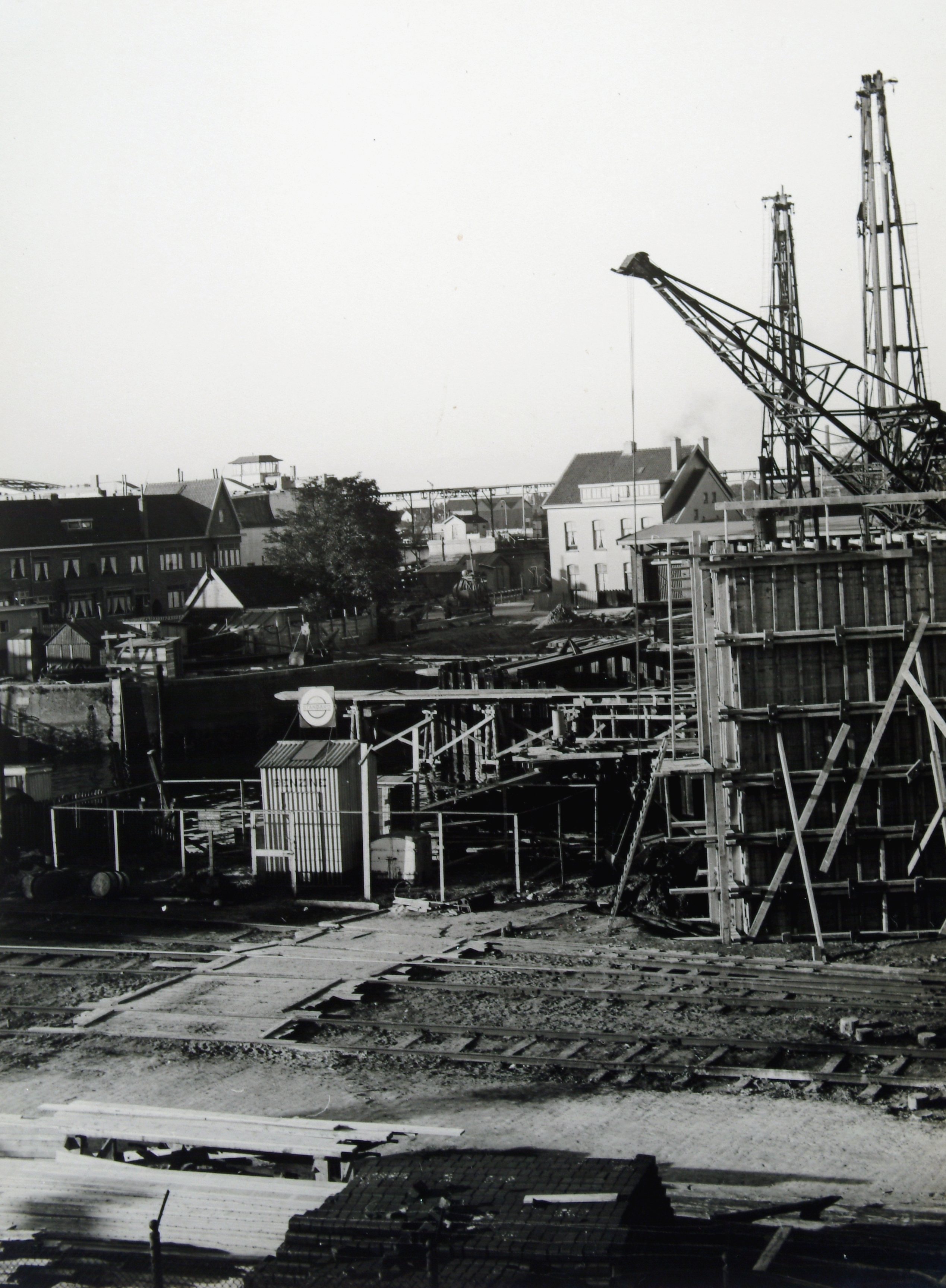 Bouw van pijlers over de Spoorweghaven voor het viaduct van de verkeersbrug over de …