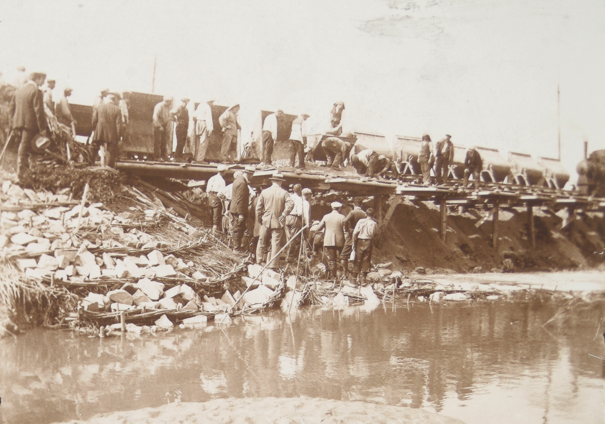 - Een rij op rails staande kiepkarren bij de inpoldering van de Dordtsche Biesbosch.