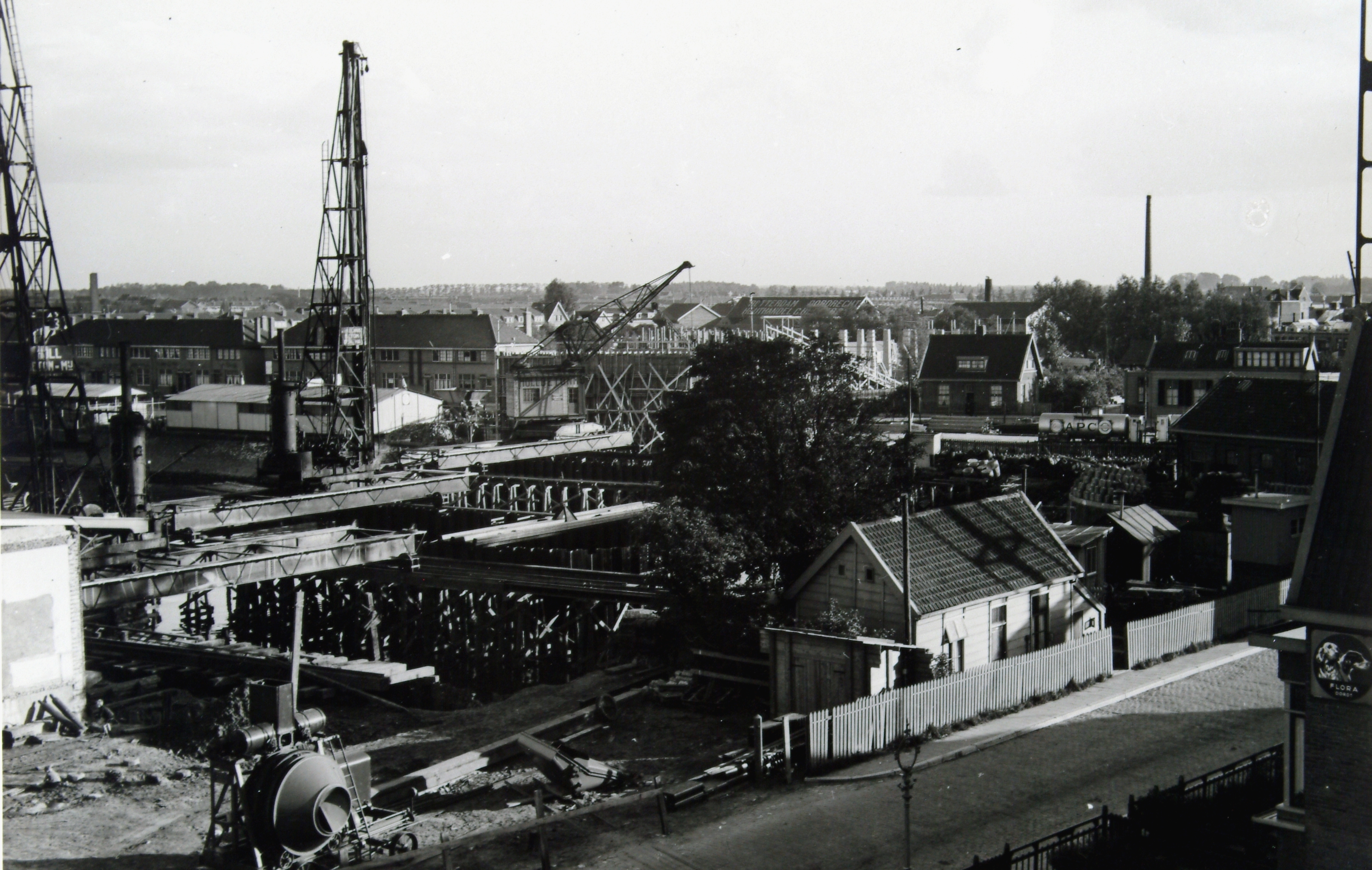 - Bouw van de oprit van de verkeersbrug over de Oude Maas in de Spoorweghaven. Van de hefpeiler van de Dokbrug gezien.