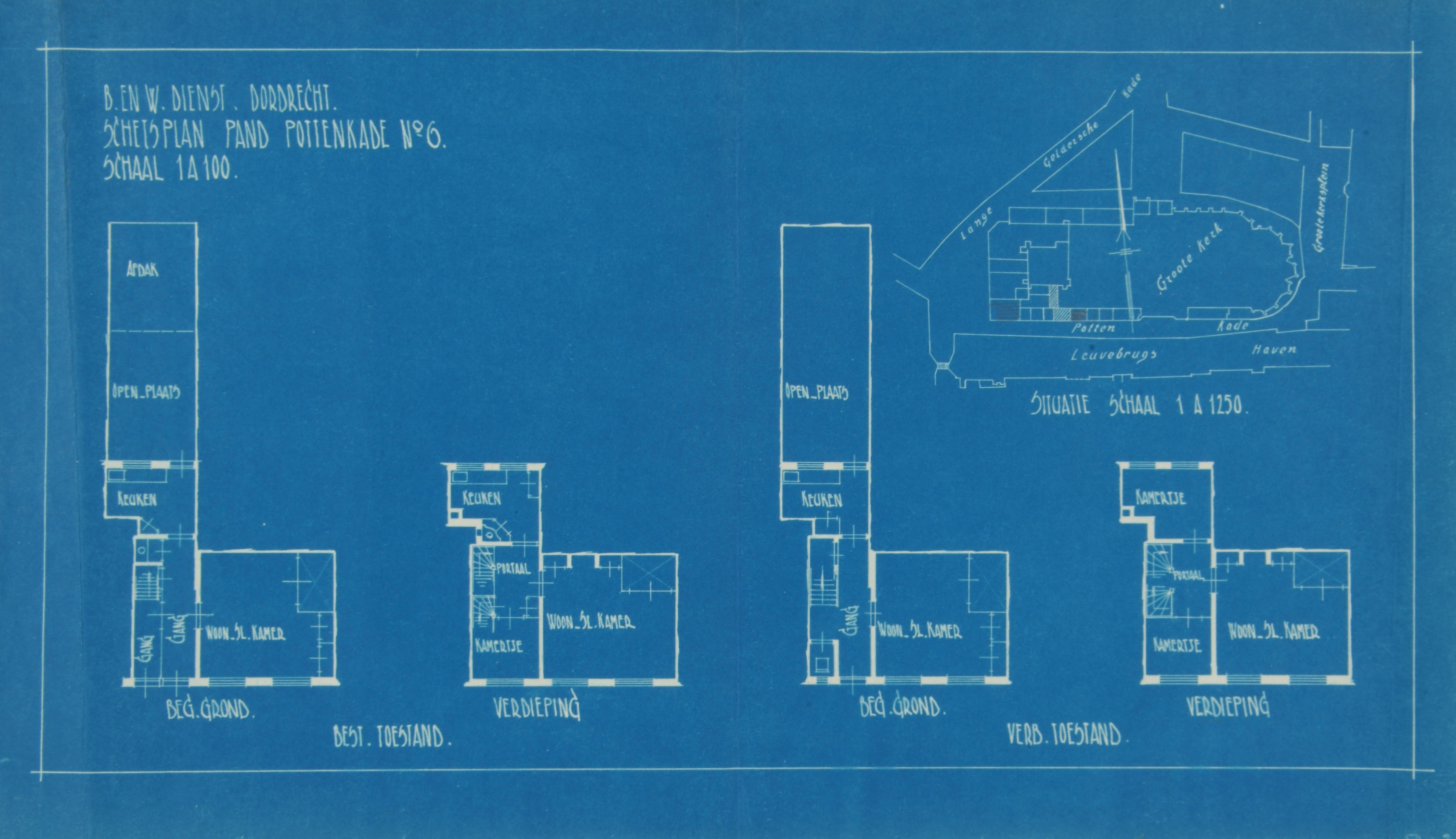 - Schetsplan voor het pand aan Pottenkade nr. 6 in bestaande en verbouwde toestand, met situatieschets.