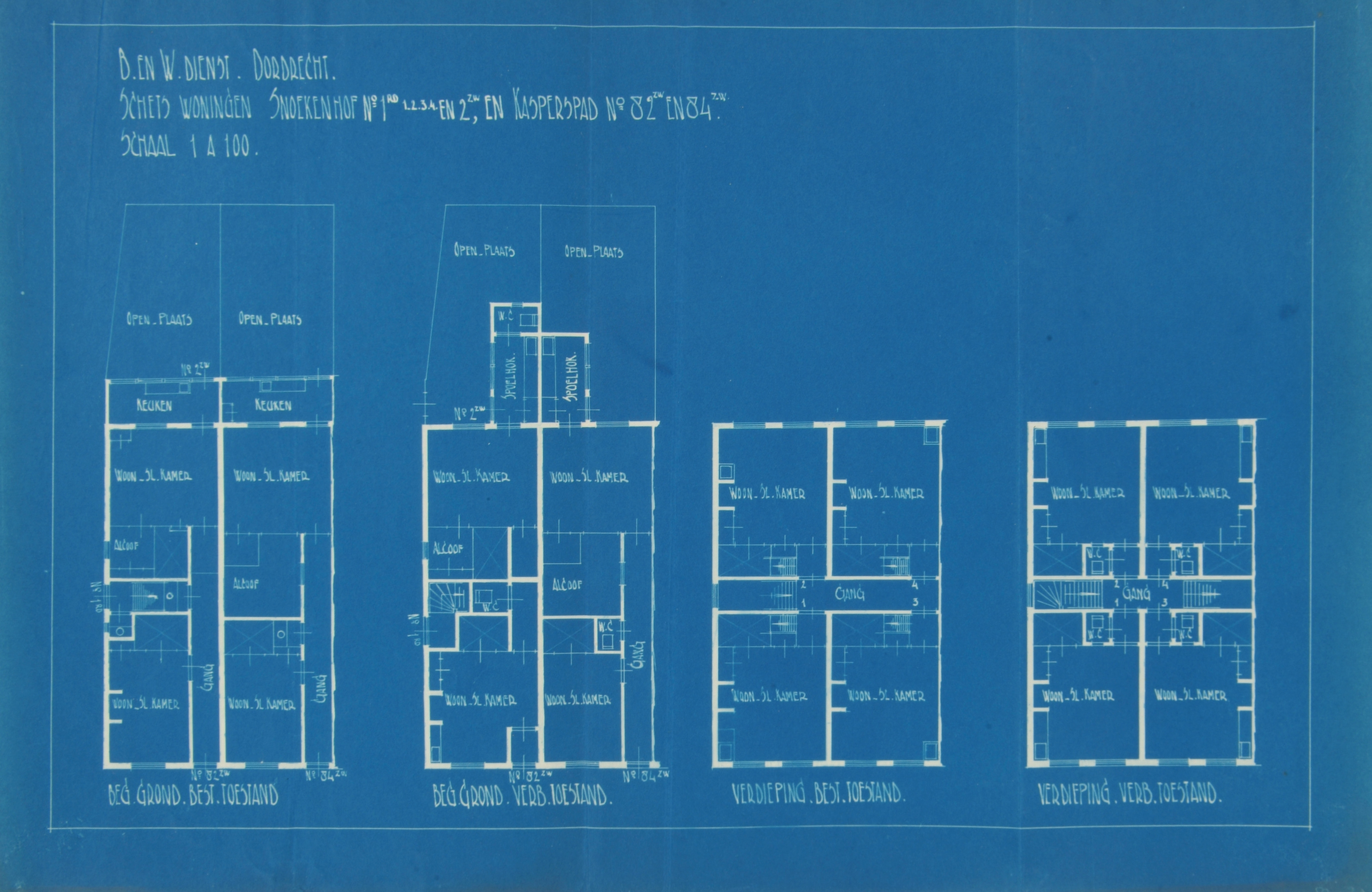 - Schets van woningen aan Snoekenhof nrs. 1en 2 en Kasperspad nrs. 82 en 84 in bestaande en verbouwde toestand.