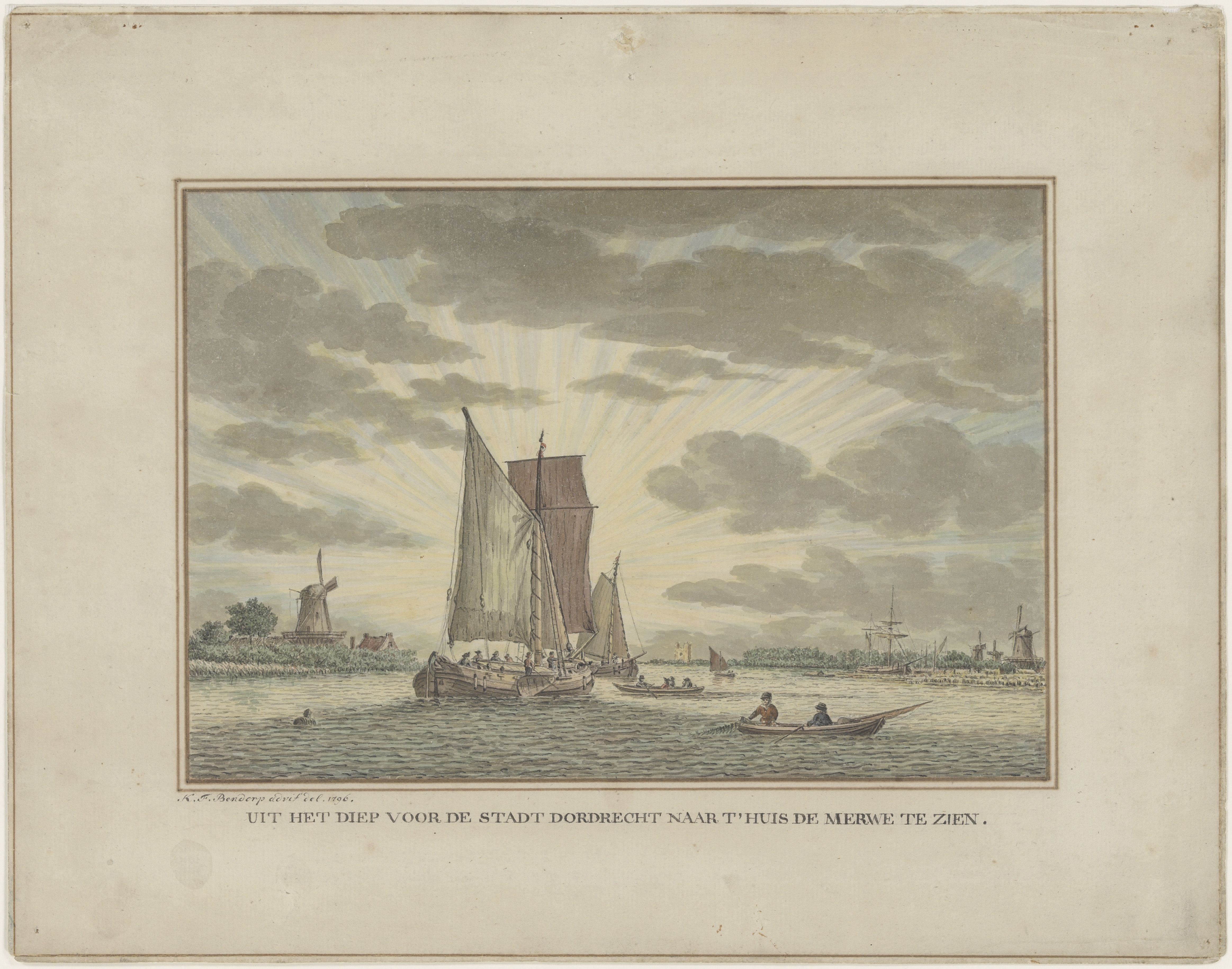 - Een zonsopgang boven de Beneden Merwede, gezien in de richting van het Huis te Merwede. Op de oevers molens aan de Noordendijk en te Papendrecht. Op het water diverse schepen.