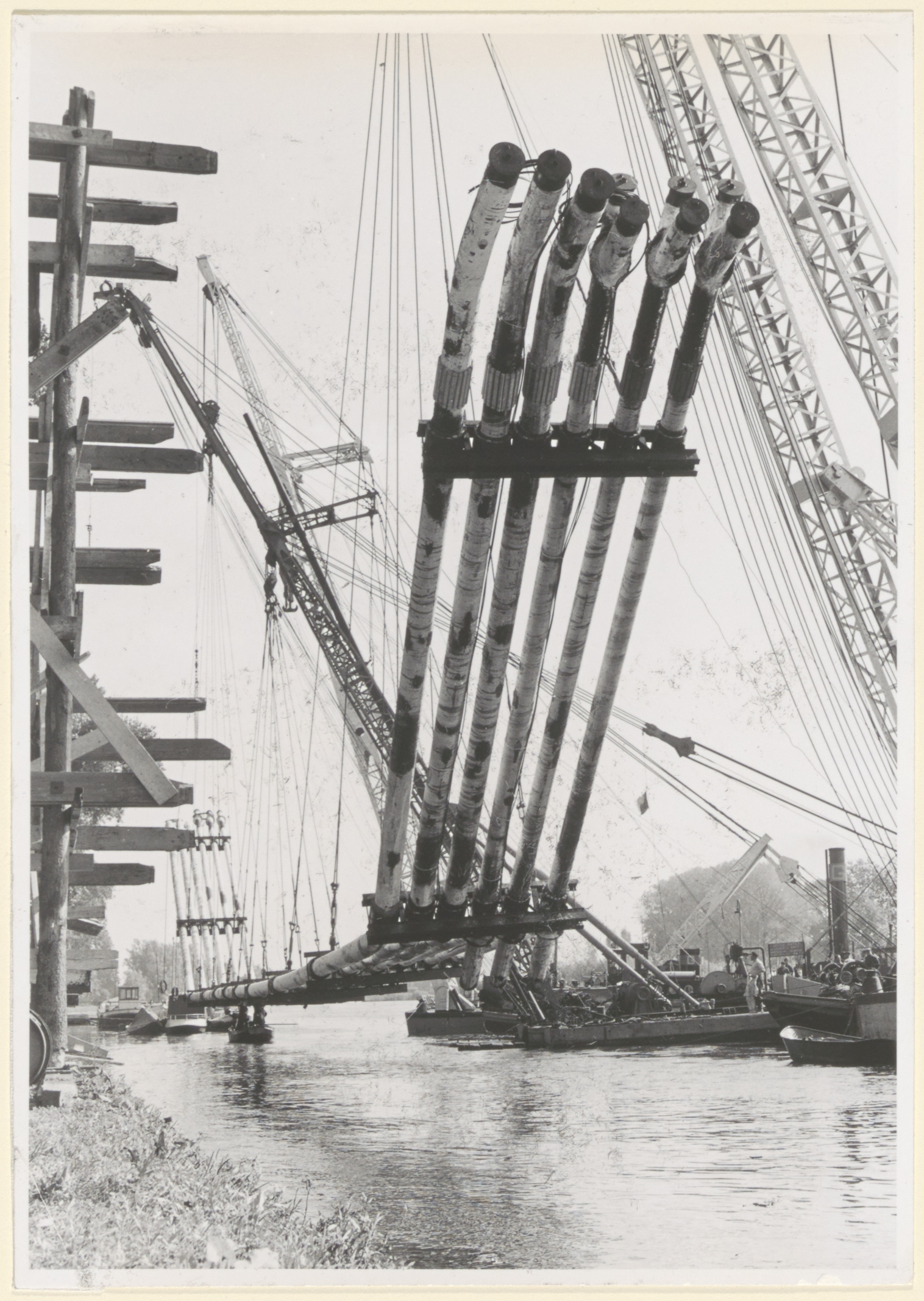 - Drie bokken plaatsen zes gas- en waterzinkers in de gegraven sleuf in het Wantij nabij de Prins Hendrikbrug.