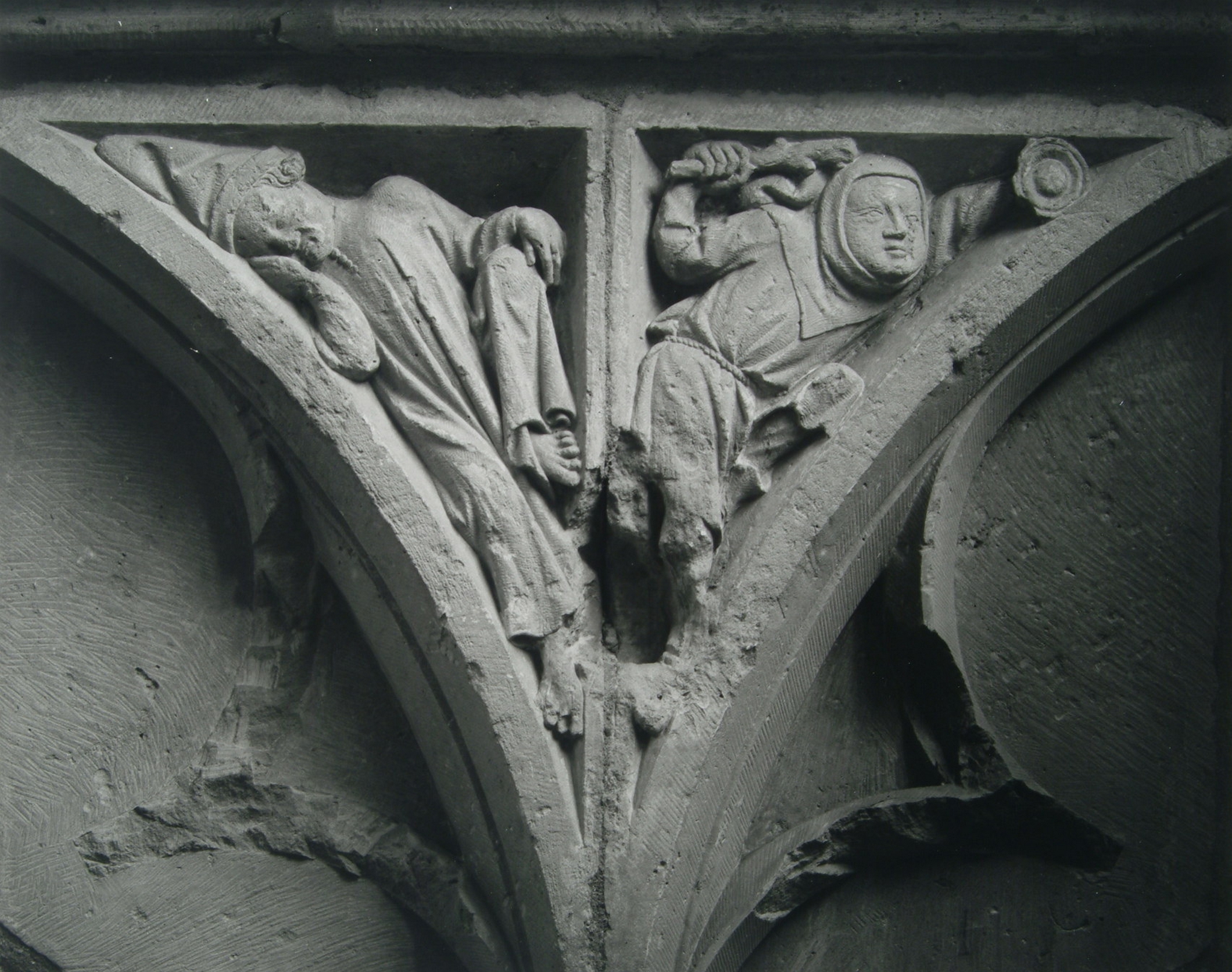 Boogvulling (zwik) in de dichte ramen van de Sint Catherijnekapel in de Grote Kerk. Links een rustend figuur met slaapmuts en rechts mogelijk een nachtwaker met knots en bel
