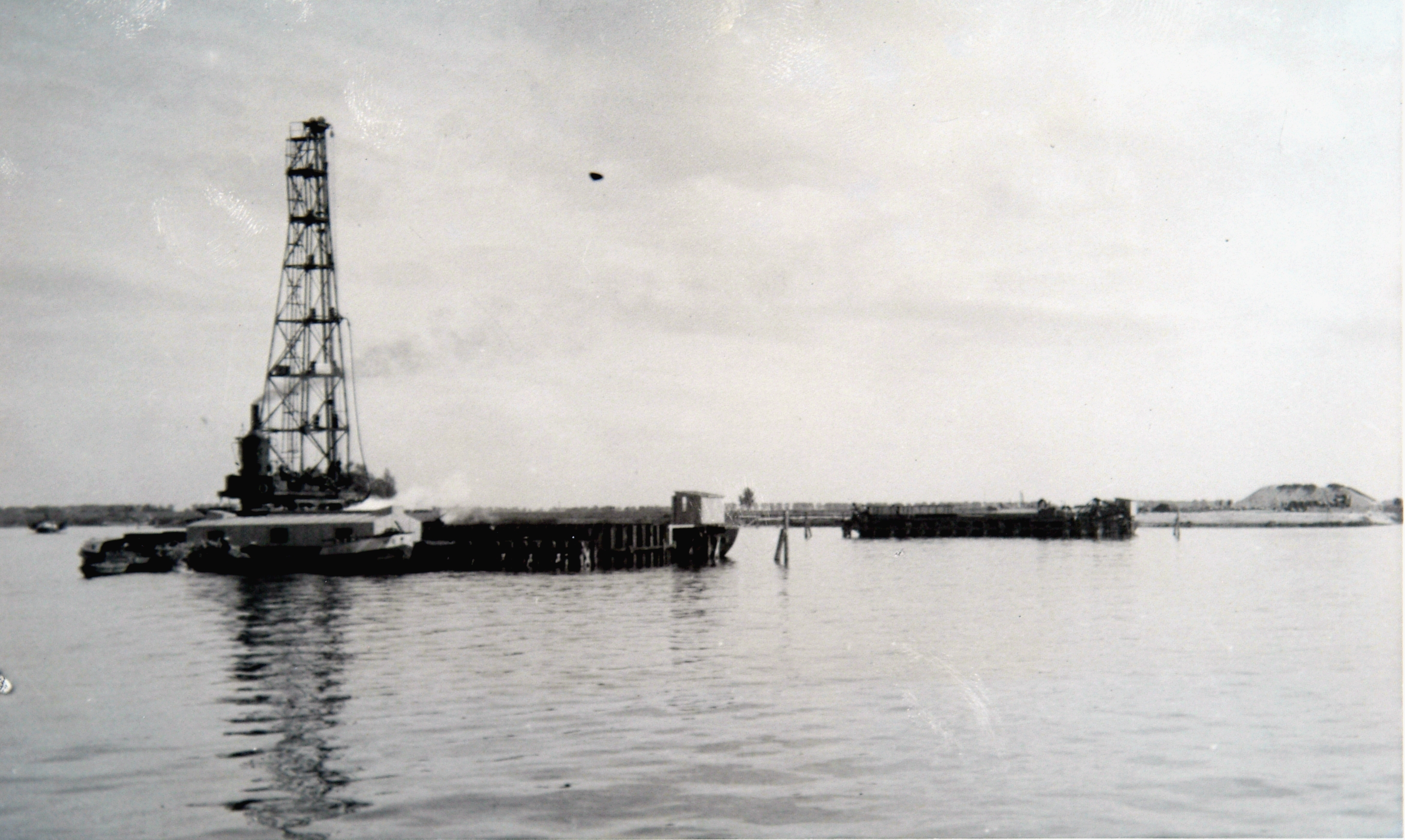 De Morrisson heimachine slaat betonnen palen ten behoeve van de pijlers voor de verkeersbrug over het Hollandsch Diep. Geheel rechts is het landingshoofd aan de kant van Moerdijk.