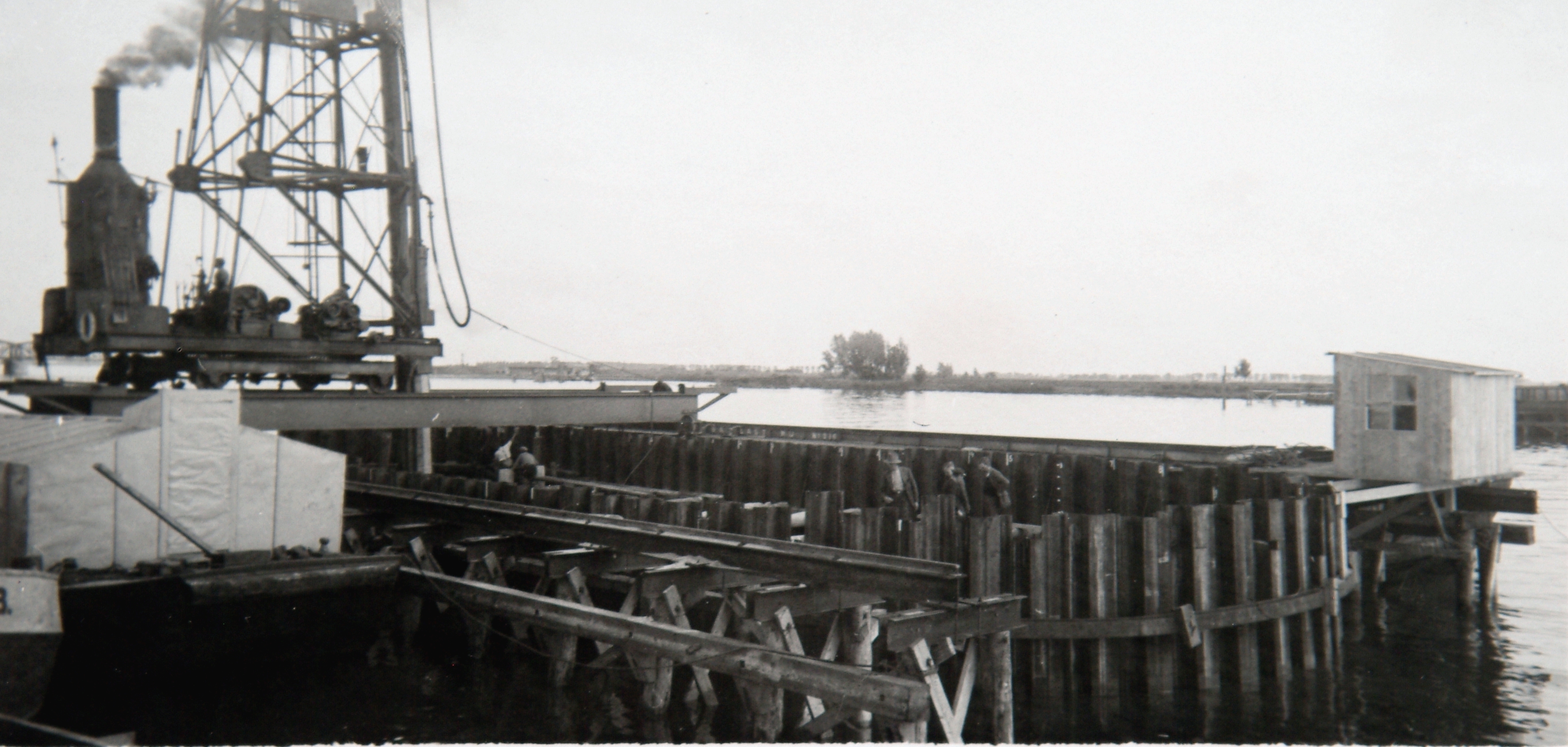 Stalen damwand waarbinnen een pijler voor de verkeersbrug over het Hollandsch Diep …