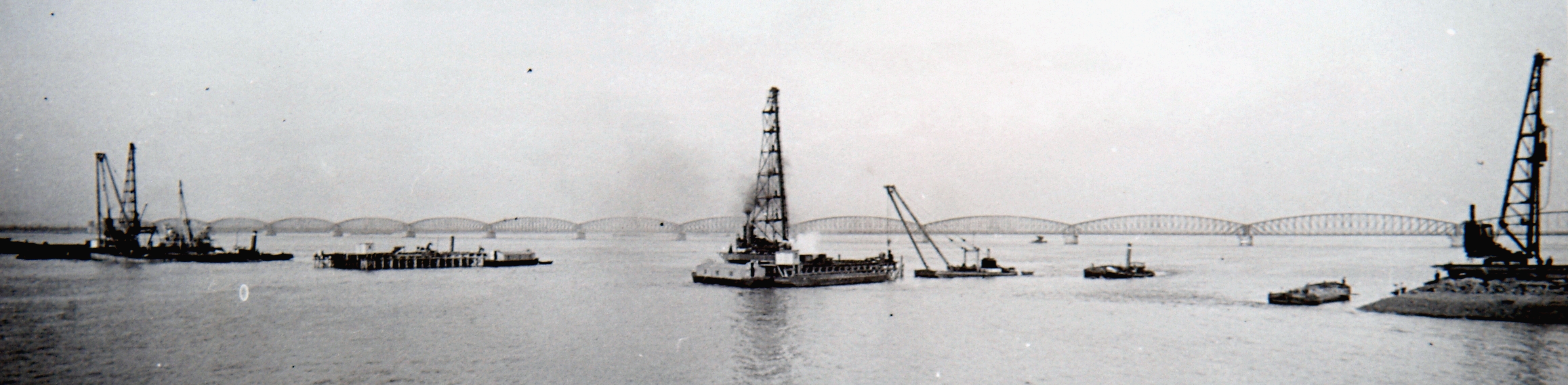 Aanleggen van pijlers voor de verkeersbrug over het Hollandsch Diep. Op de achtergrond de spoorbrug naar Moerdijk.
