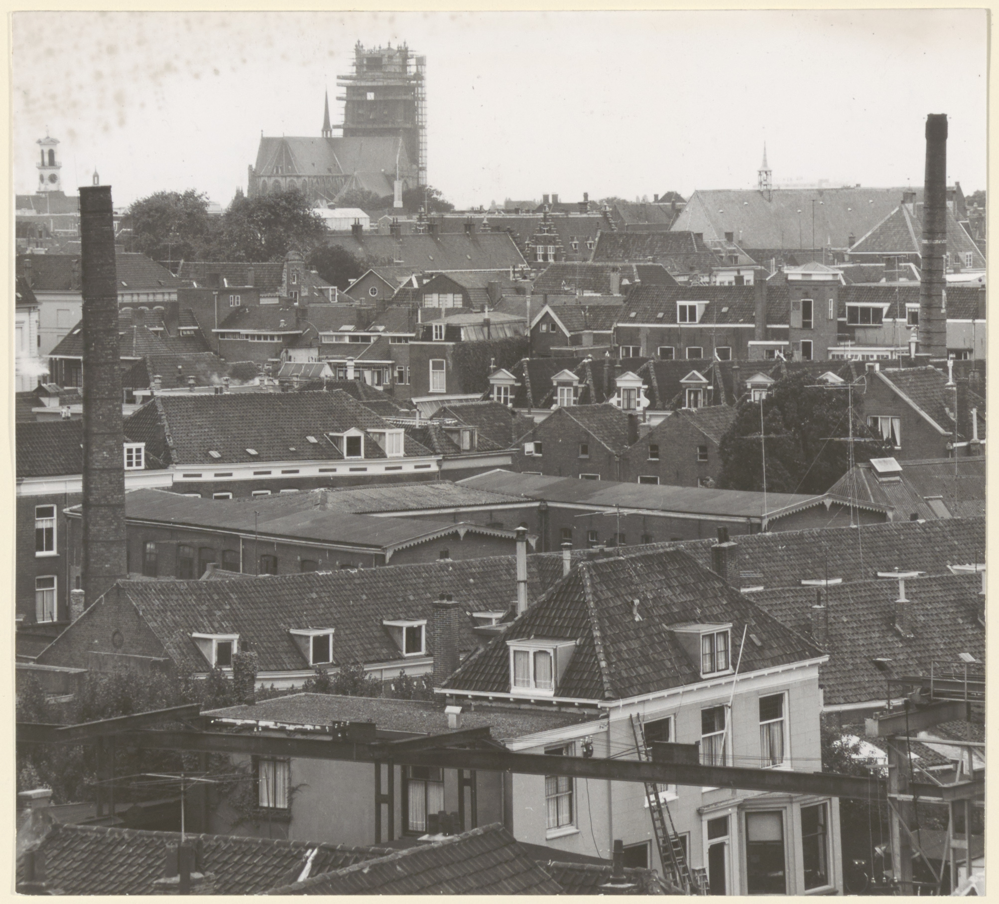 - Gezicht vanaf molen Kijck over den Dijck in westelijke richting. Op de voorgrond machinefabriek Vos, rechts schoorsteen van de DMI aan het Kromhout en de brandweerkazerne aan de Vest, links Stadhuis en Grote Kerk.