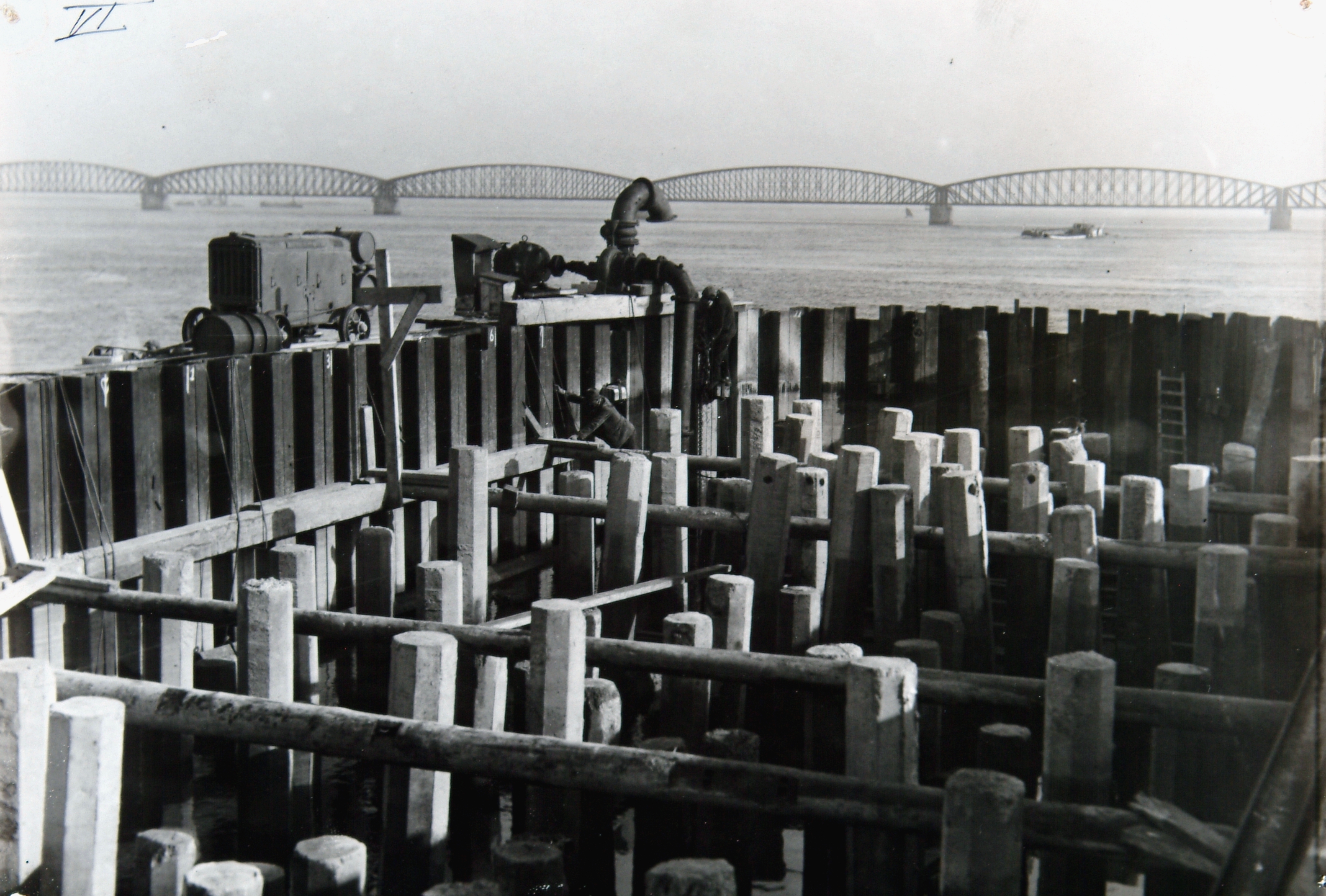 - Bouwput van pijler twee voor de verkeersbrug over het Hollandsch Diep. De eerste betonlaag is al gestort, maar de koppen van de palen moeten nog worden afgehakt. De spoorbrug ligt op de achtergrond.