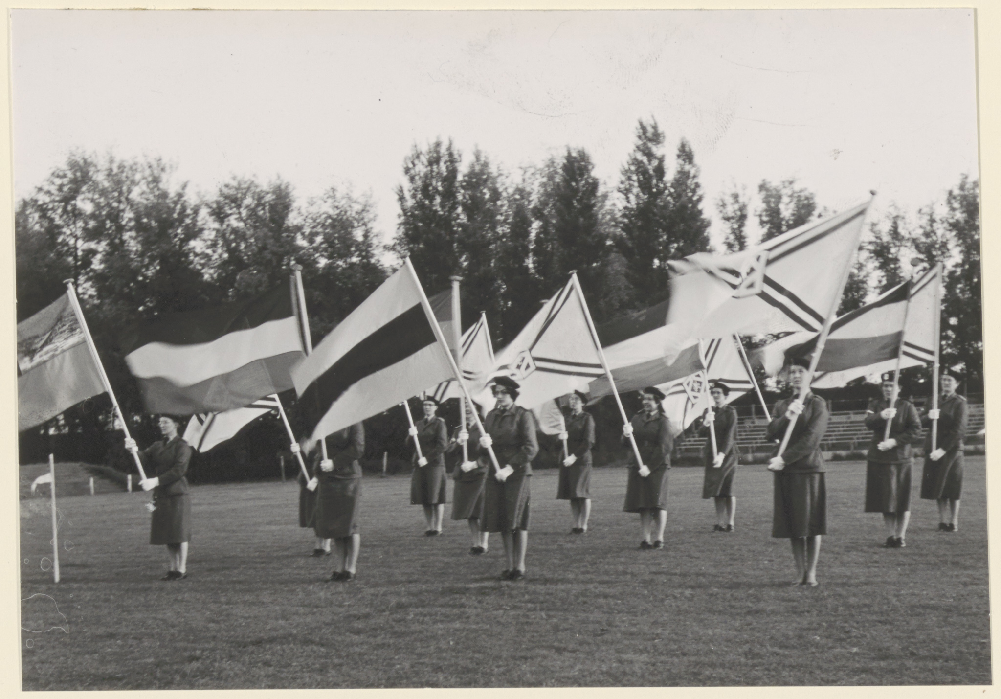 - Vrouwelijke Band & Binding Vendelzwaaiers bij een voetbalwedstrijd tussen doktoren en politie op het D.F.C.-terrein aan de Krommedijk.