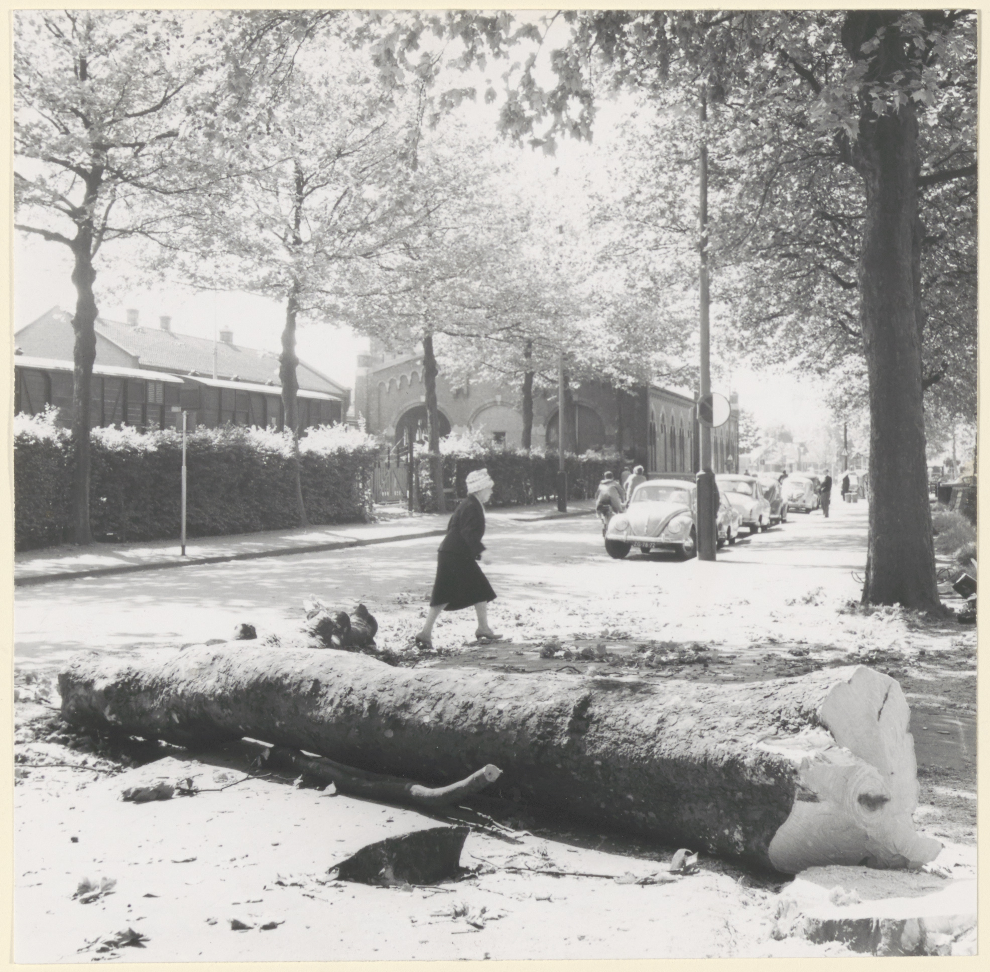 - Bomen rooien op de Burgemeester de Raadtsingel t.b.v de wegverbreding. In het midden de goederenloods van Van Gend & Loos.