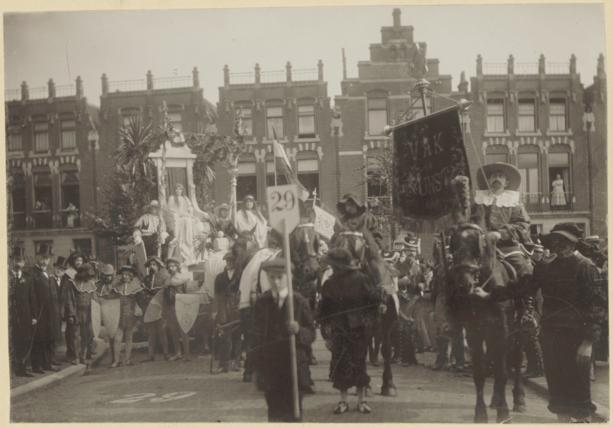 - Onafhankelijkheidsfeesten te Dordrecht. Een van de praalwagens van de optocht op het Rozenhof.