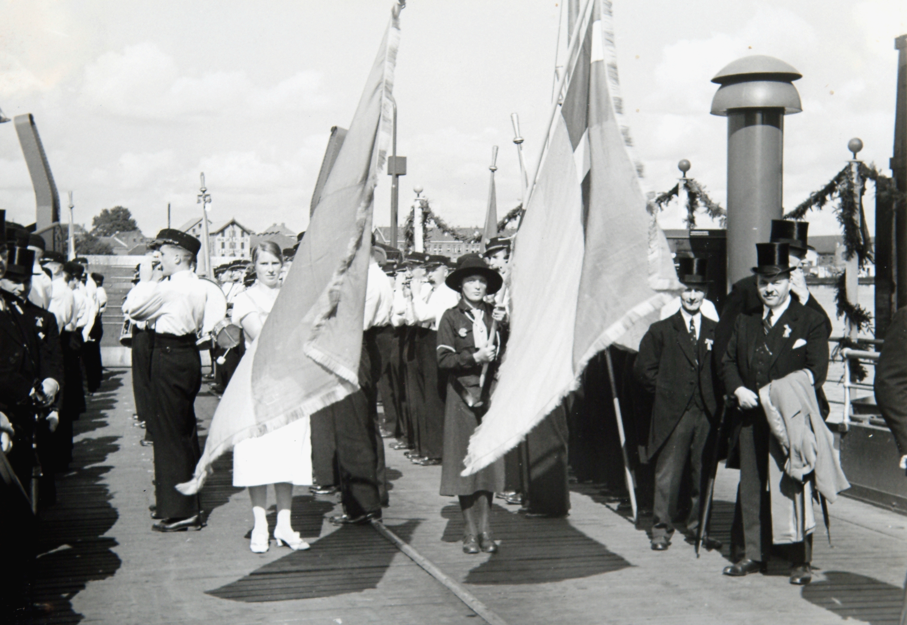 - Bestuur van vereniging Oranjedag en Jubal op de pont naar Zwijndrecht op weg naar het 40-jarig regeringsjubileum van koningin Wilhelmina in Amsterdam.