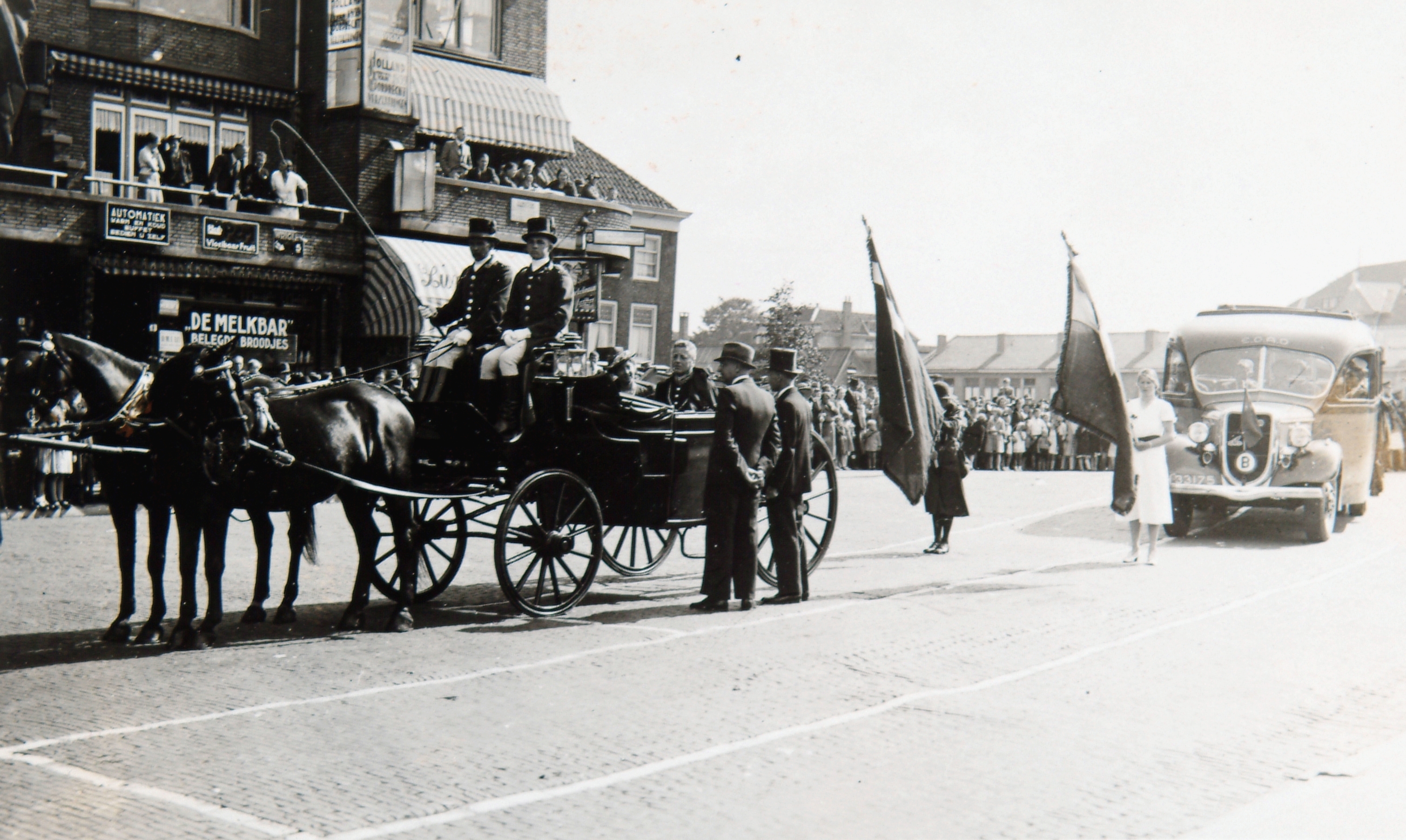 - Op het Blauwpoortsplein doen burgemeester Bleeker en zijn vrouw de delegatie van Dordtse jeugd uitgeleide op weg naar het 40-jarig regeringsjubileum van koningin Wilhelmina in Amsterdam. De bus van de E.D.A.D. vaart over vanaf het Zwijndrechts Veer.