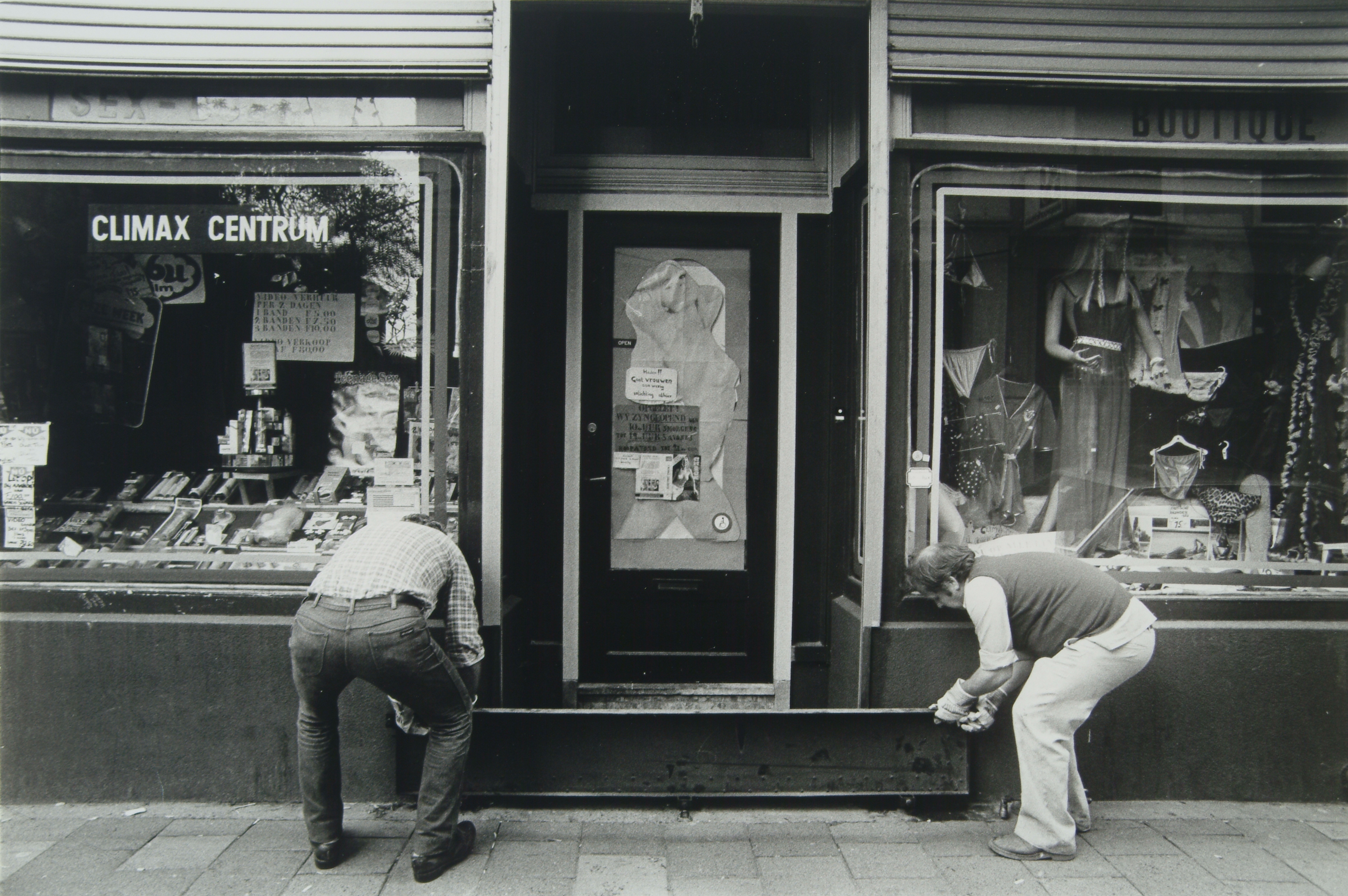 Controle van de waterkering door het plaatsen van een vloedplank voor de deur van sexboutique Climax Centrum op de Voorstraat