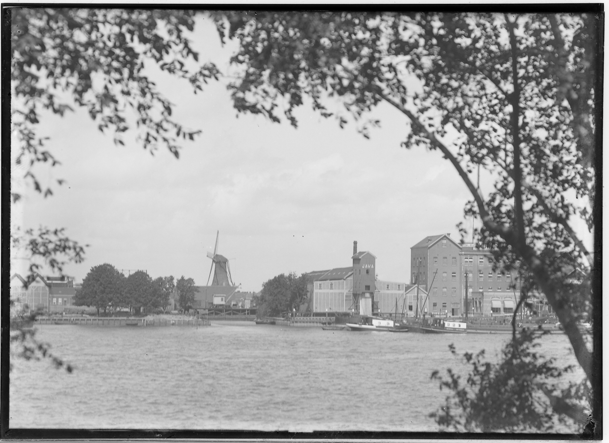 - Gezicht op Zwijndrecht over de Oude Maas met rijstpelmolen en pakhuizen en rechts Hotel het Witte Paard