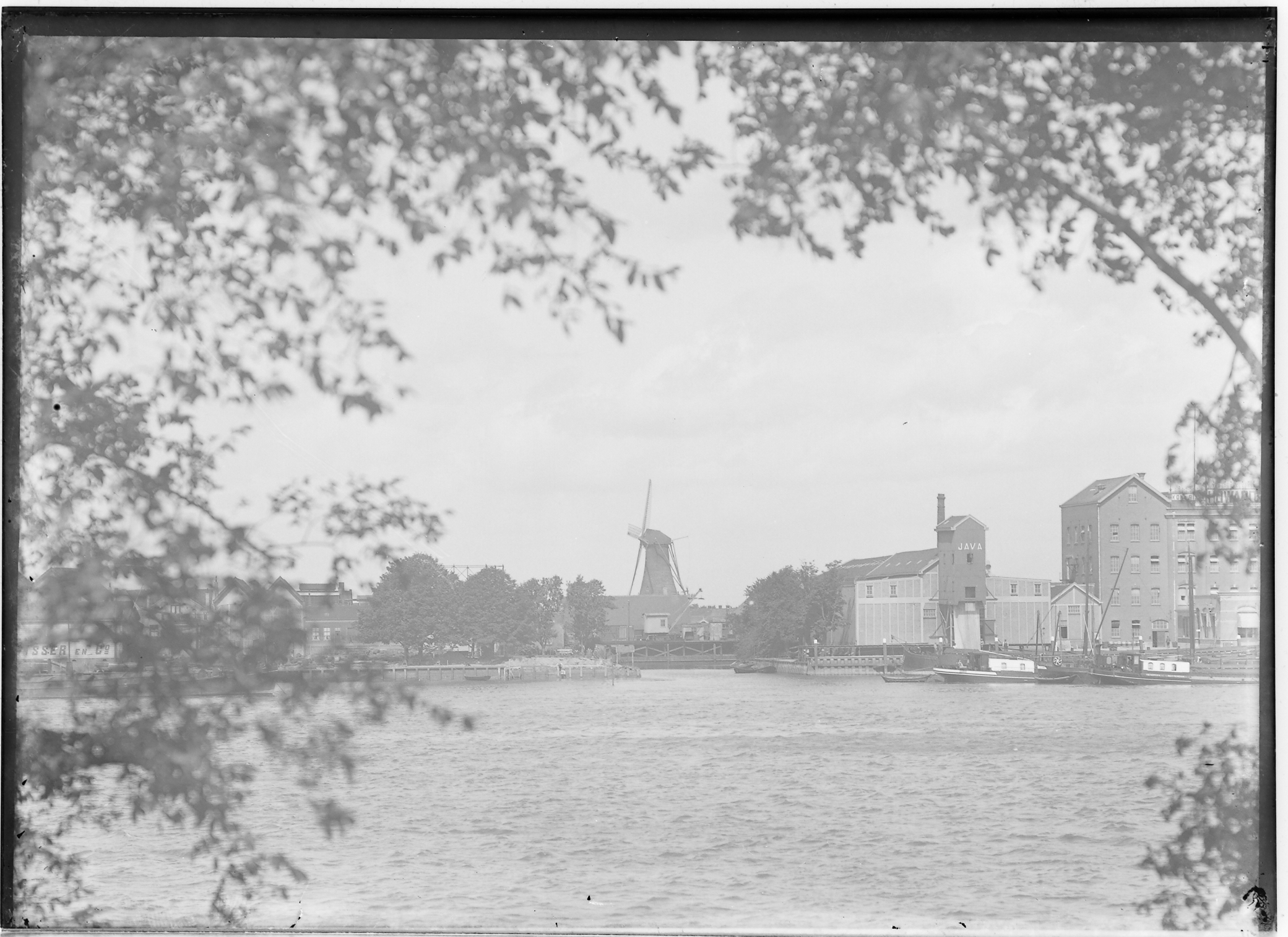 - Gezicht op Zwijndrecht over de Oude Maas met rijstpelmolen en pakhuizen en rechts Hotel het Witte Paard