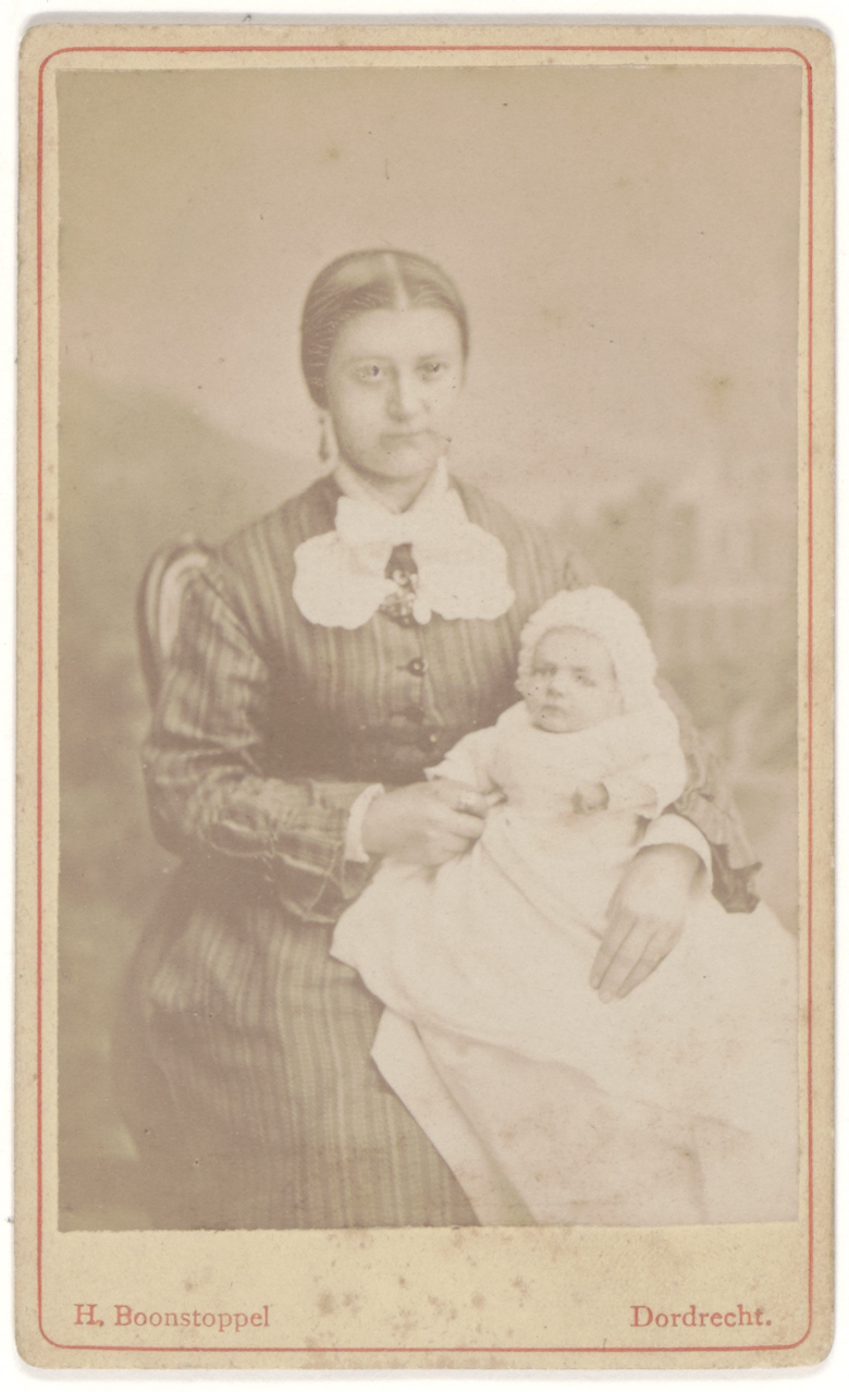 Portret van een onbekende persoon met baby gemaakt door de Dordtse fotograaf H. Boonstoppel die van 1883 tot 1900 werkzaam was in de Visstraat tegenover het postkantoor.
