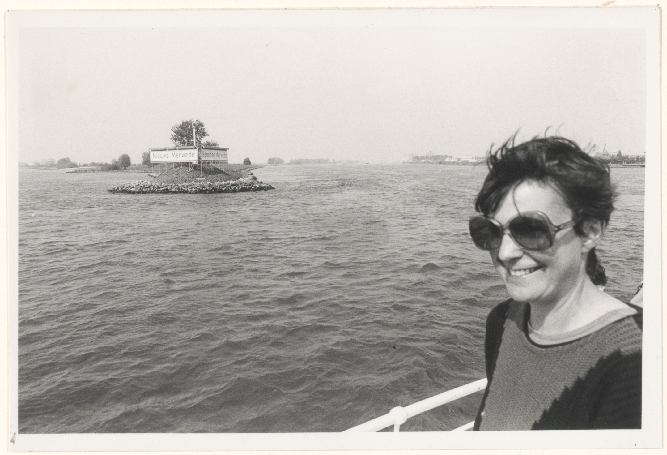 - Het oostelijke puntje van het Eiland van Dordrecht waar de Merwede zich splitst in de Beneden Merwede (rechts) en de Nieuwe Merwede; gezien vanaf de Veerboot 3 op de Merwede; rechts op de voorgrond mevrouw M.H. Molendijk-Kooy, echtgenote van de fotograaf.