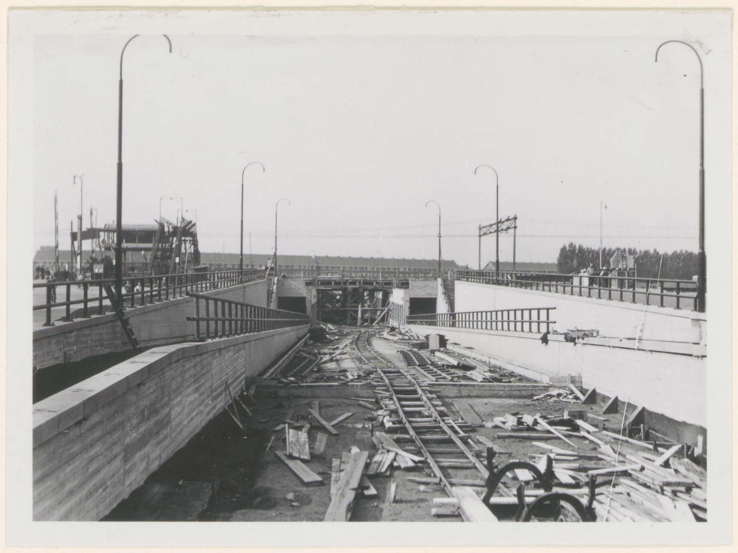 - Aanleg van de tunnel Spuiweg - Krispijn. Links het seinhuis van de spoorwegen en de tijdelijke voetgangersbrug, op de achtergrond de Van Baerlestraat.